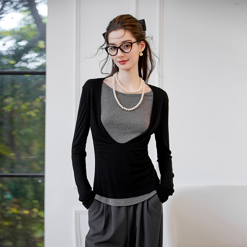 T恤女 气质简约圆领长袖 白鹿语撞色拼接假两件上衣2025春季 新款