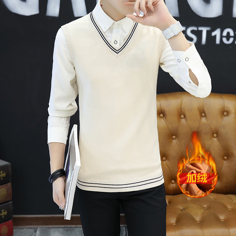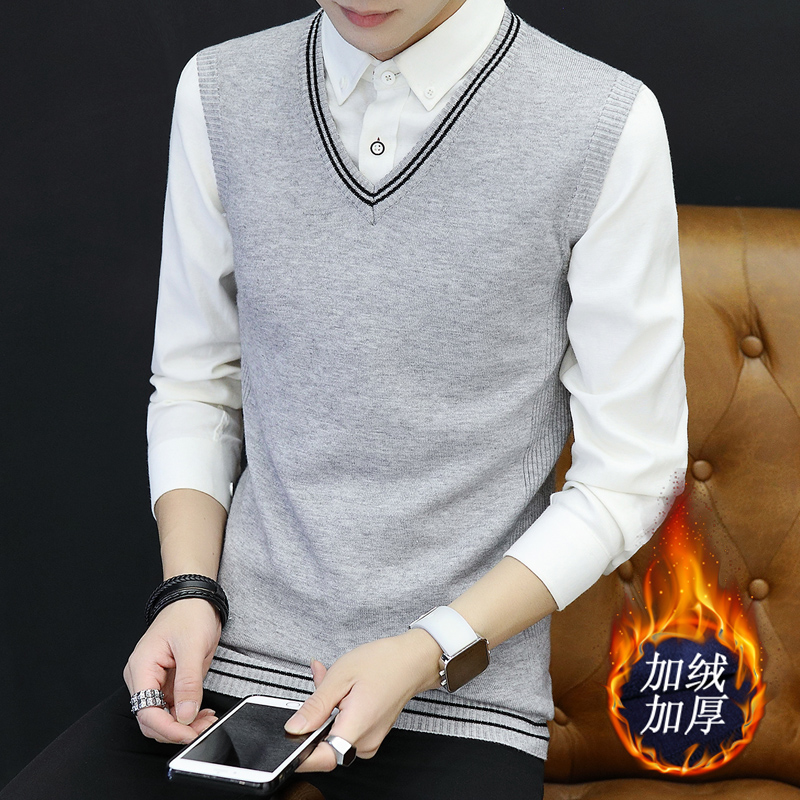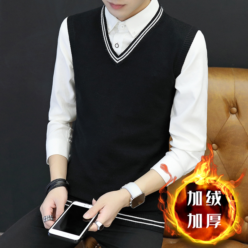 坎肩马甲 V领毛衣针织衫 保暖毛背心男秋冬季 加绒加厚加棉马夹无袖