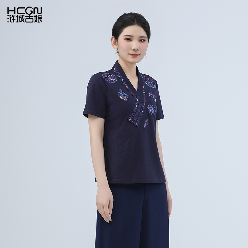 夏季 浒城古娘新款 国风T恤上衣女款 百搭新中式 棉质刺绣气质V领短袖