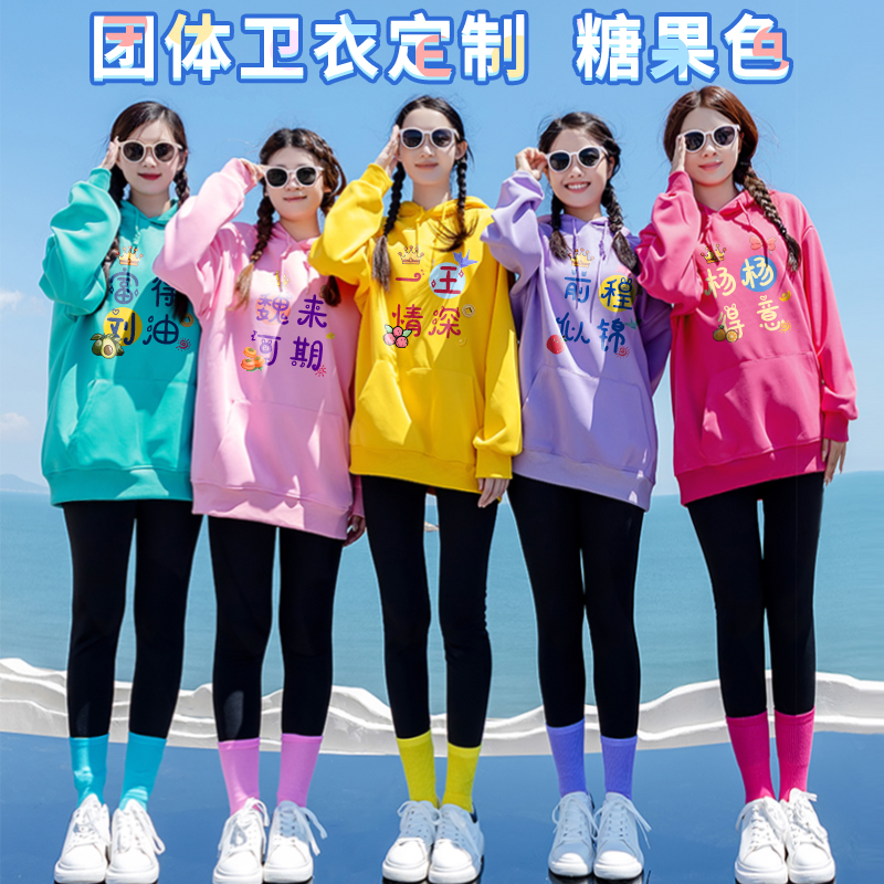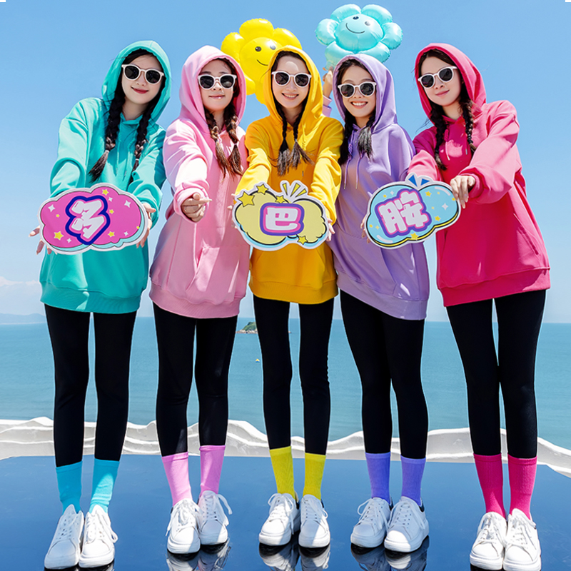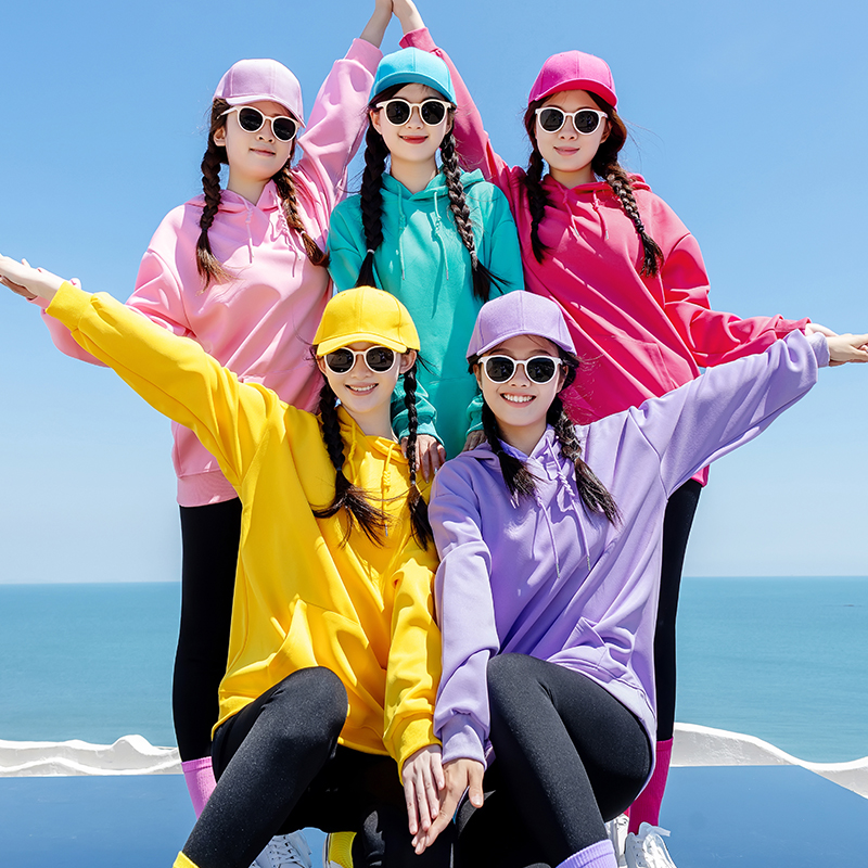 彩色卫衣女连帽加绒落肩闺蜜装 团建出游聚会团体活动表演服定制
