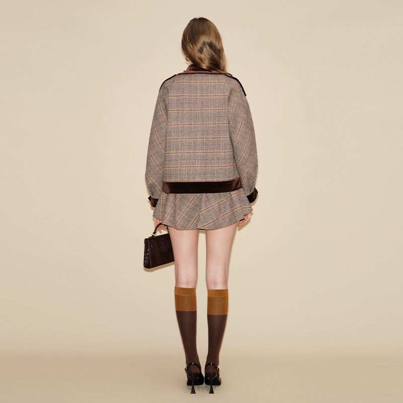 EIMISMOSOL格子丝绒撞料短夹克半裙秋冬新款 型好设计 复古摩登版