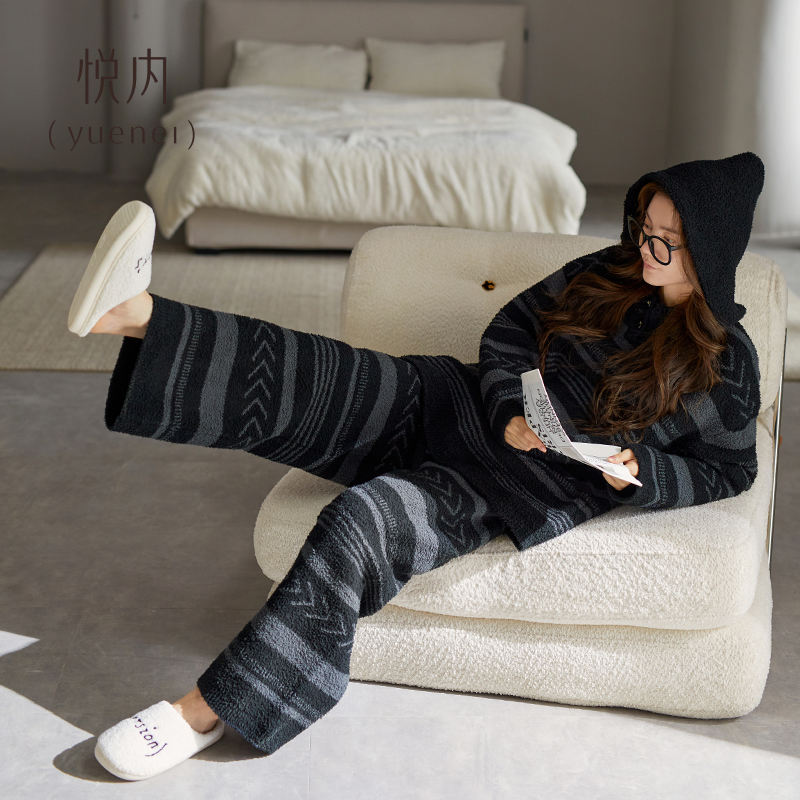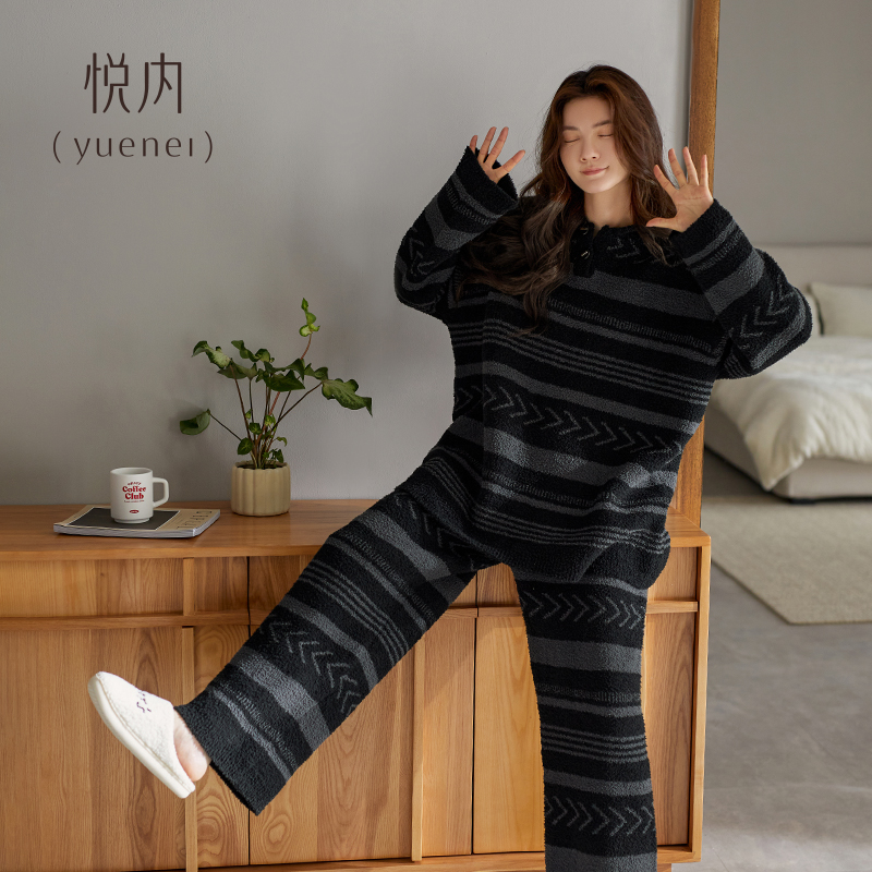 悦内半边绒睡衣女秋冬季 珊瑚绒加绒加厚保暖毛绒家居服软绵绵 冬款