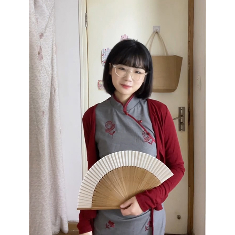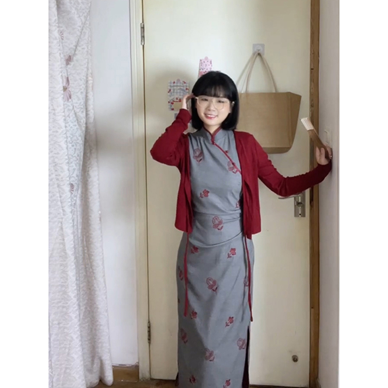 细语岁月 灰色蝴蝶结盘扣旗袍连衣裙开衫 秋季 新中式 女 新款 乔拉
