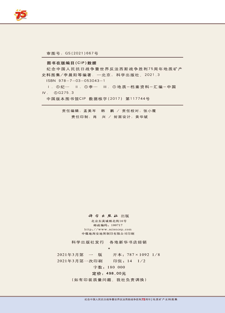 纪念中国人民抗日战争暨世界反法西斯战争胜利75周年地质矿产史料图集 社 李晨阳等科学出版
