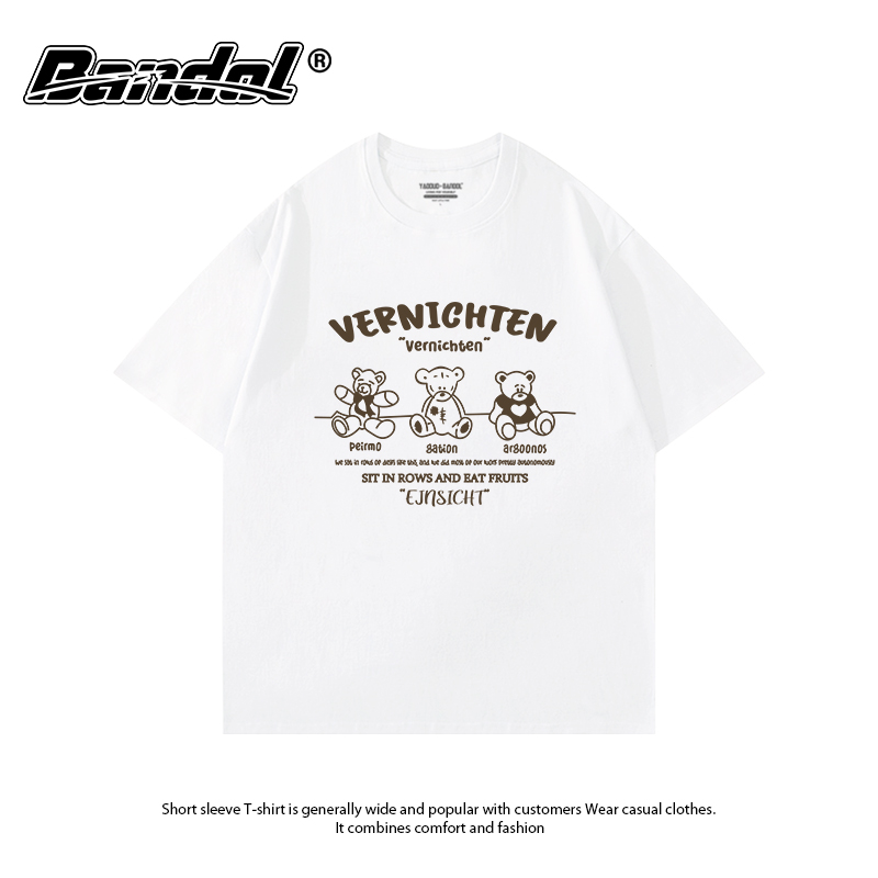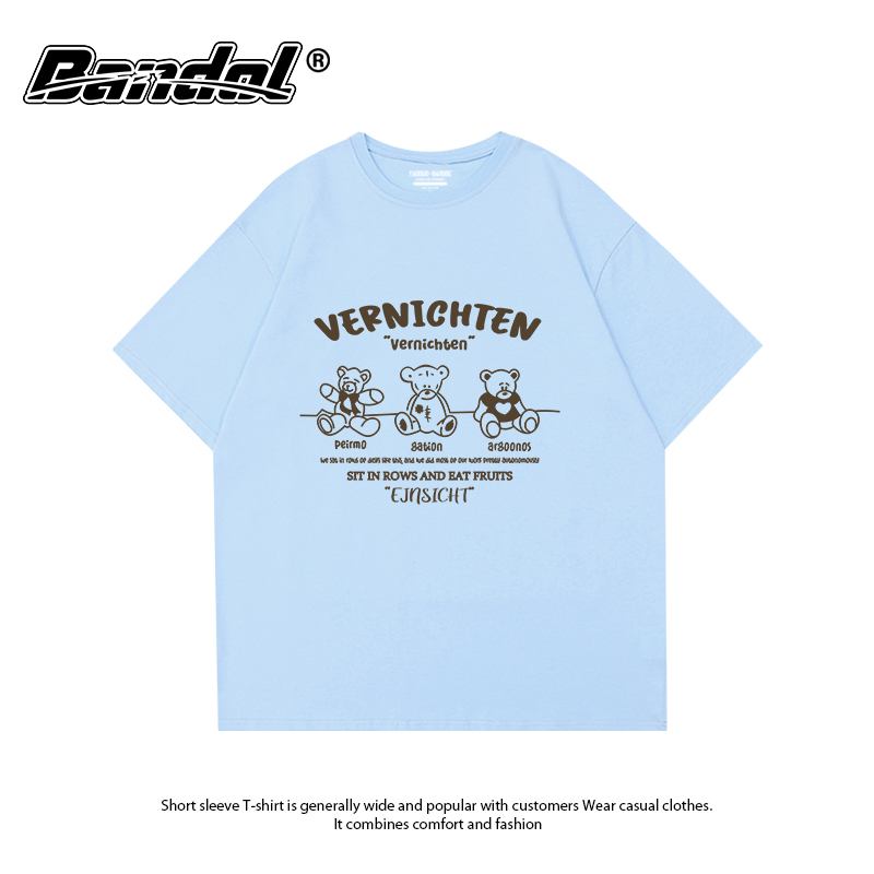 chic港风复古线条小熊ins风盐系高级感杏色短袖 T恤上衣正肩bf风夏