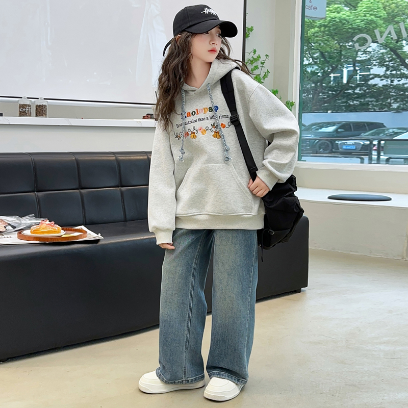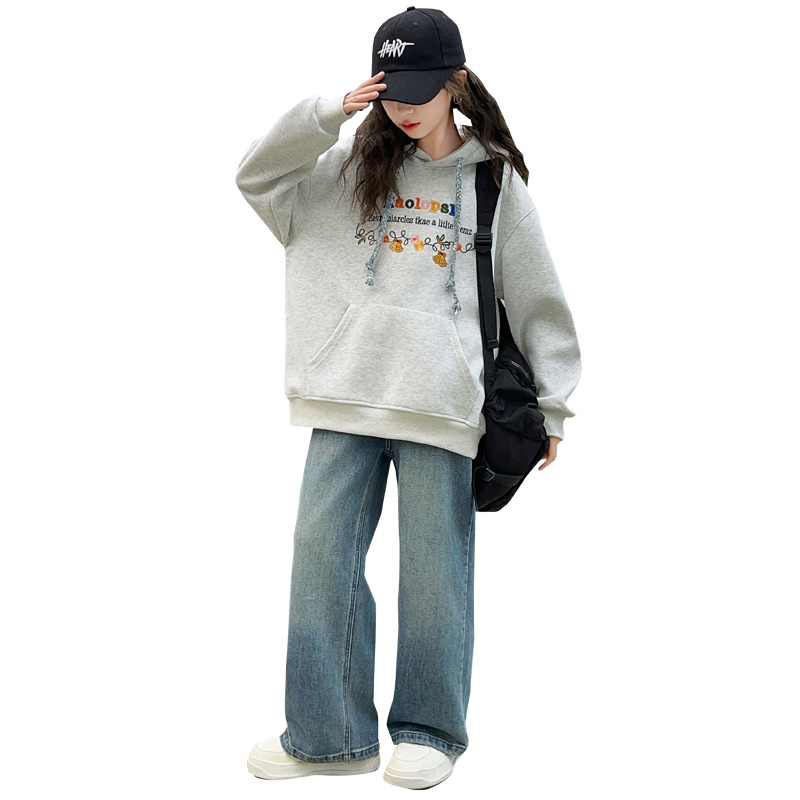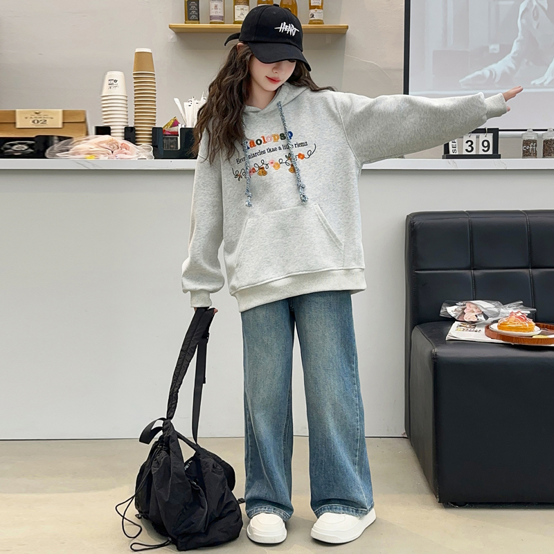 加绒上衣儿童牛仔裤 女童秋装 洋气女大童秋冬款 2025新款 子 卫衣套装