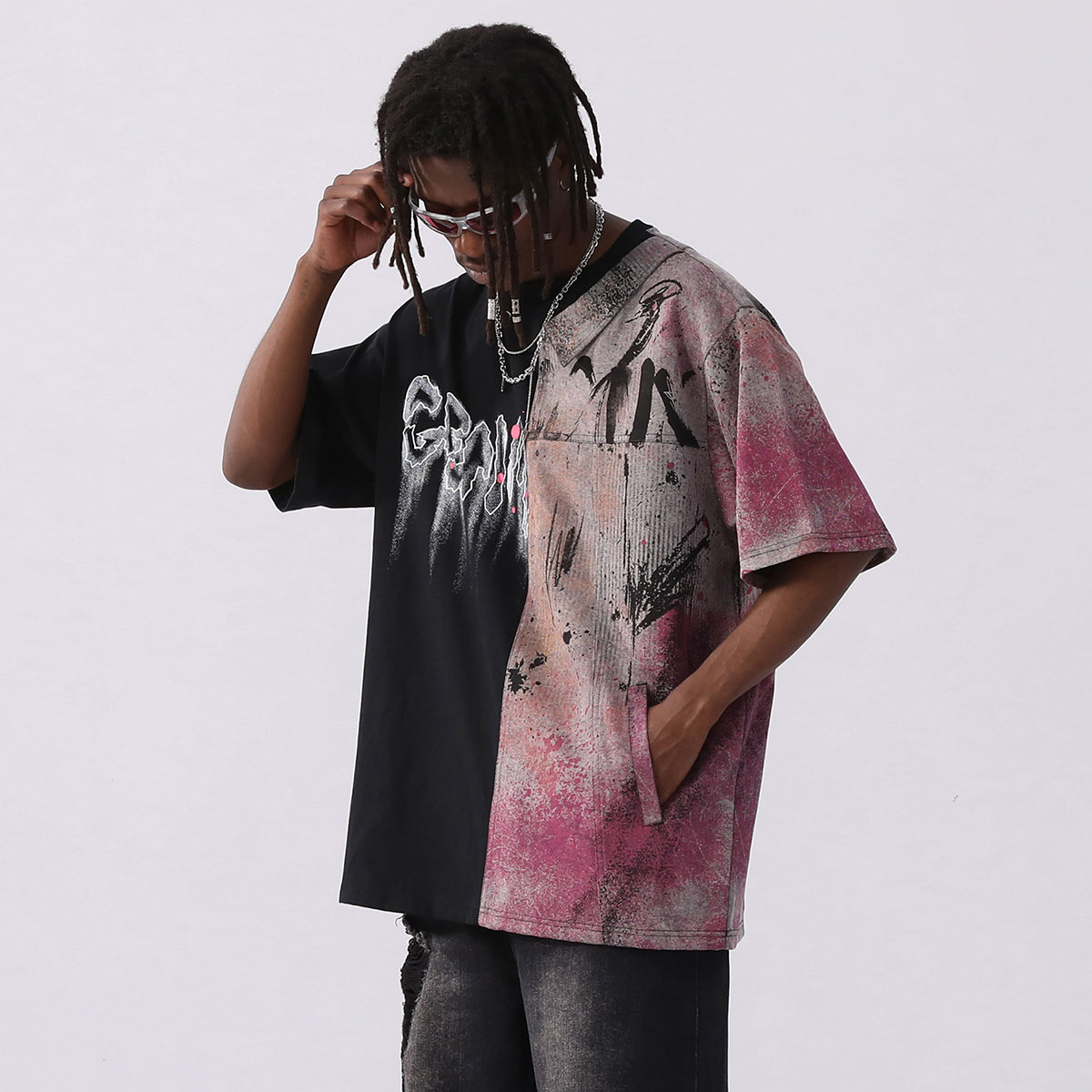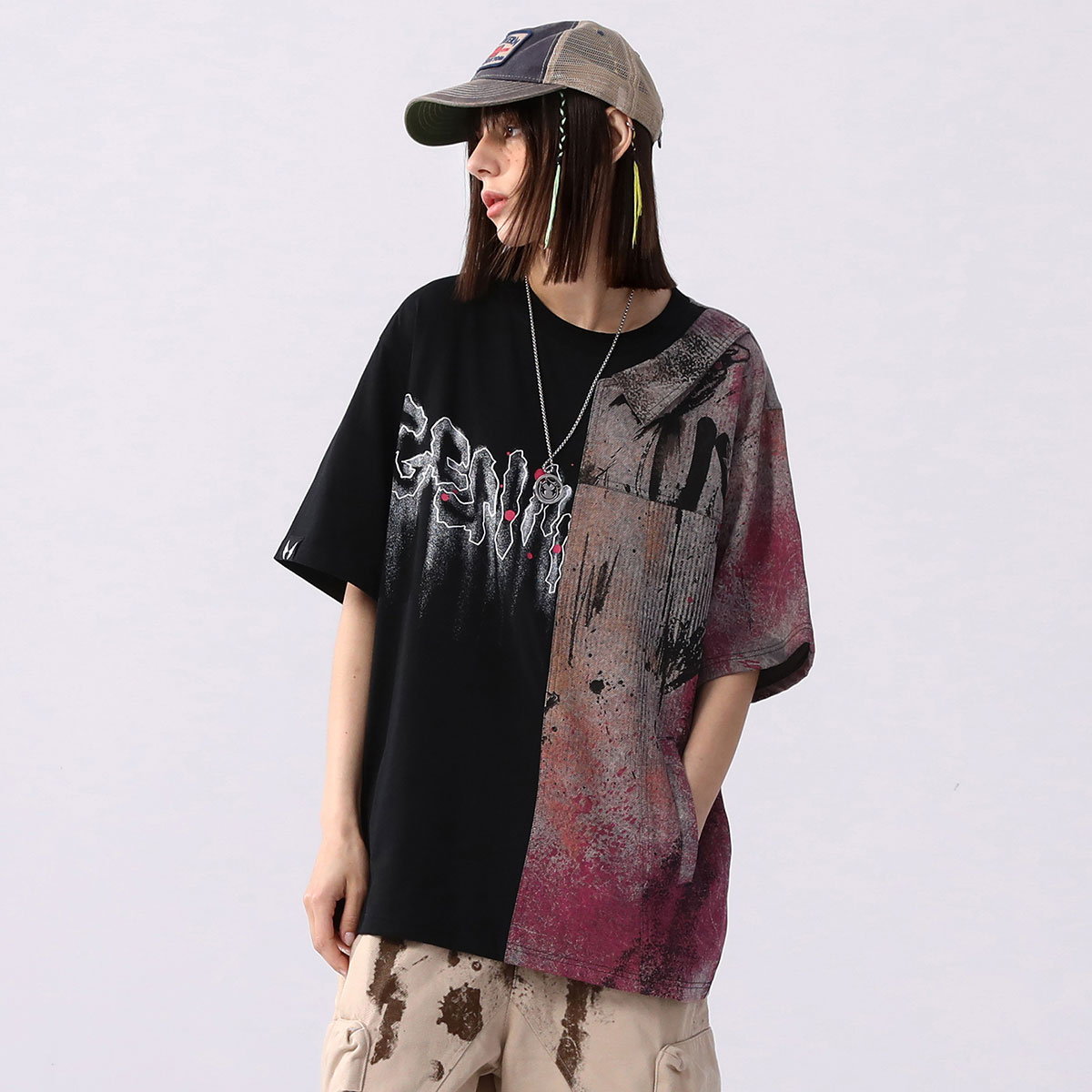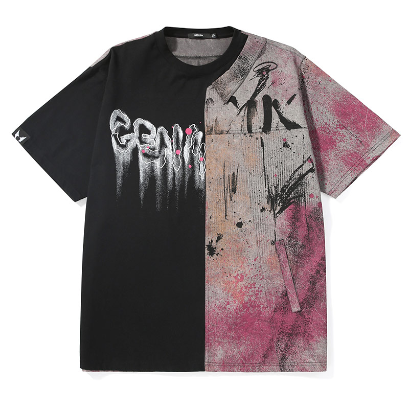 复古风泼墨印花贴布双领衬衫 新款 领T恤男 短袖 GENANX闪电潮牌夏季