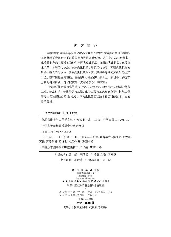 科学出版 化妆品配方与工艺学实验 著 何秋星 社书籍KX 高等医药院校化妆品专业系列