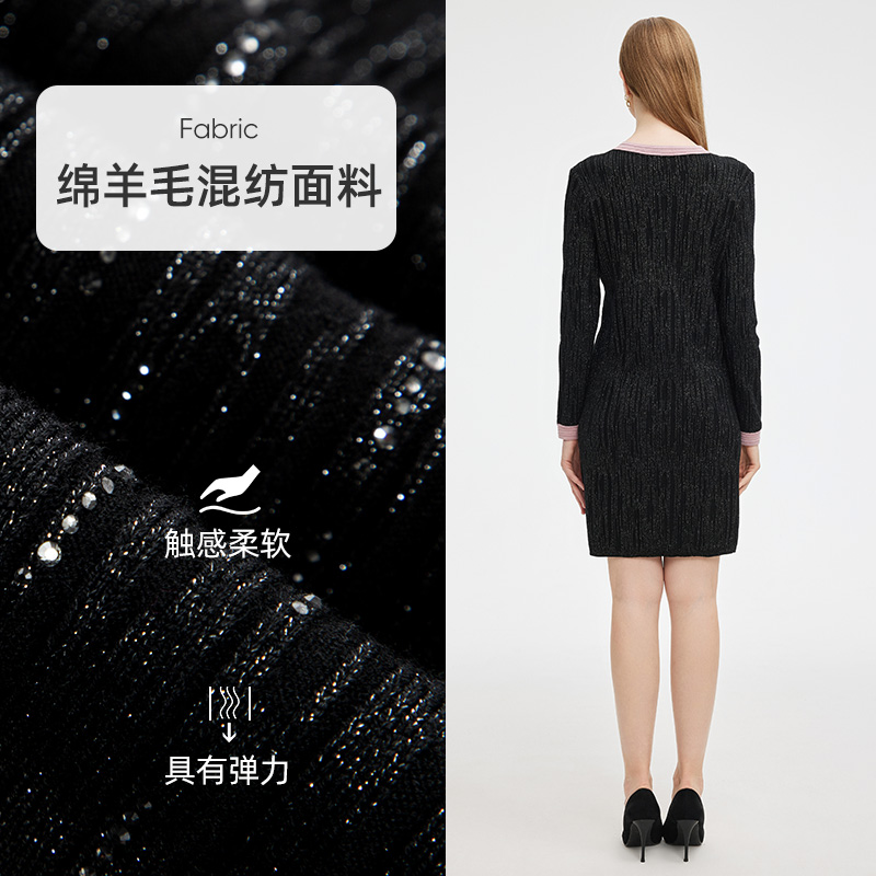 时尚 专柜正品 修身 黑色V领小香风针织连衣裙子长袖 马天奴秋冬女装