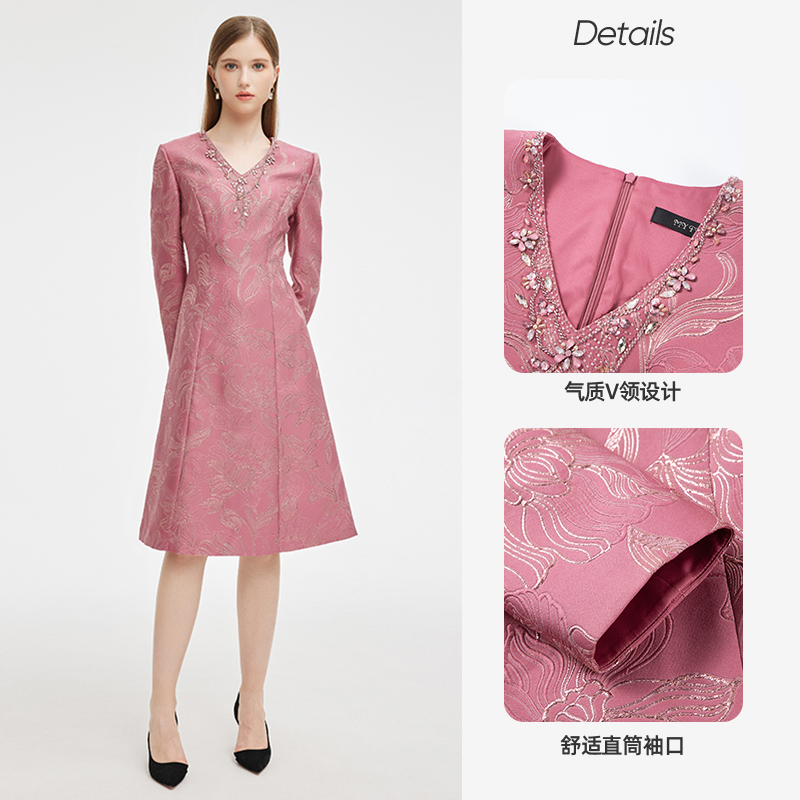 百搭 粉色提花V领连衣裙子礼服礼裙子时尚 专柜正品 马天奴秋冬女装