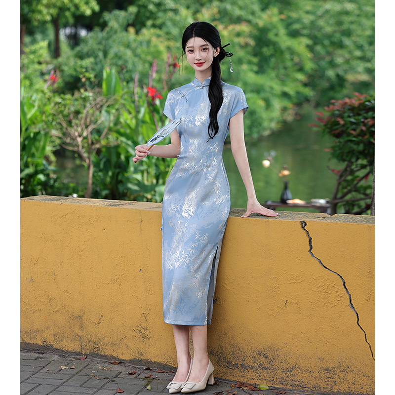 连衣裙女夏高级感开叉长裙旗袍 人丝肌理提花新中式 JKJS 幽兰影