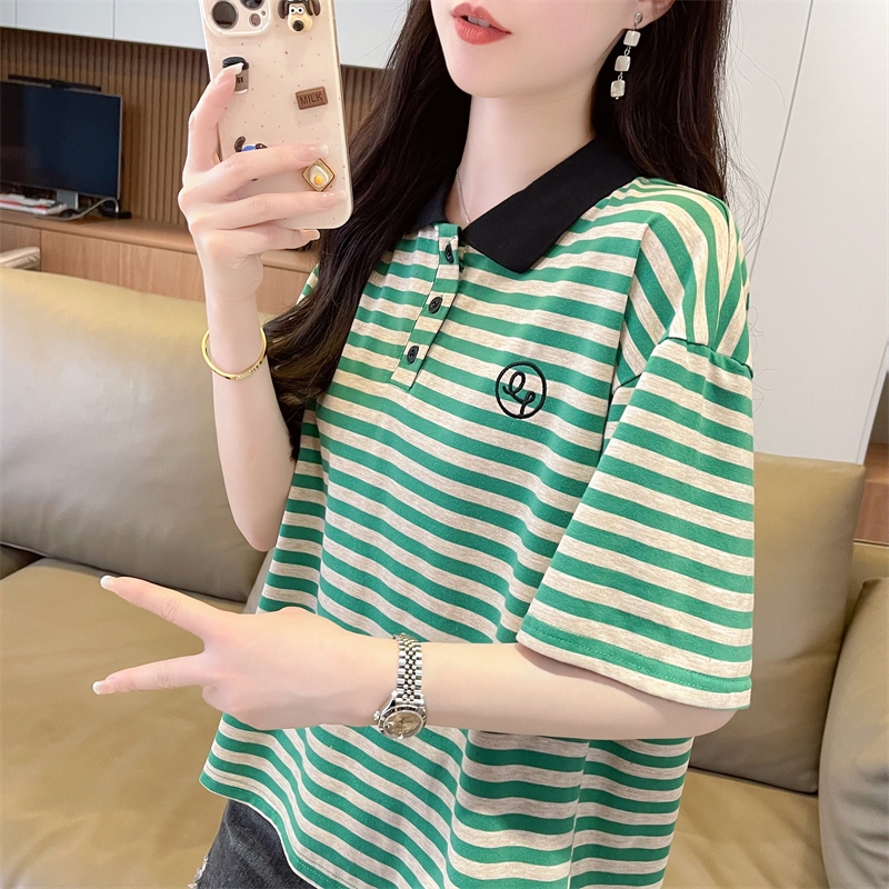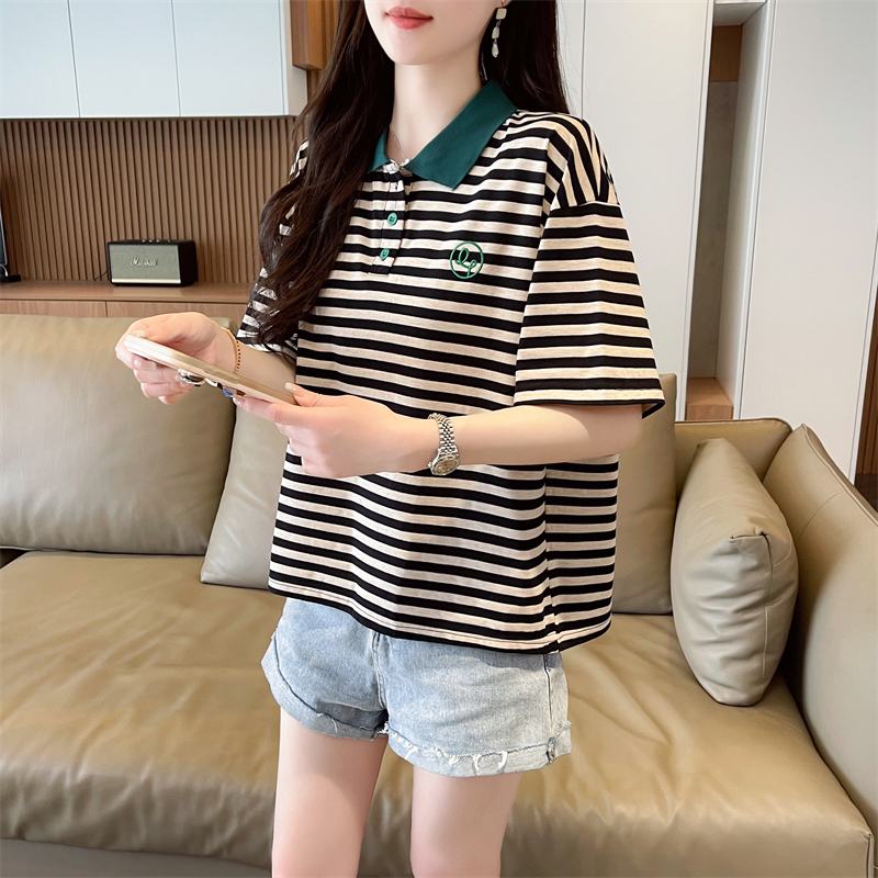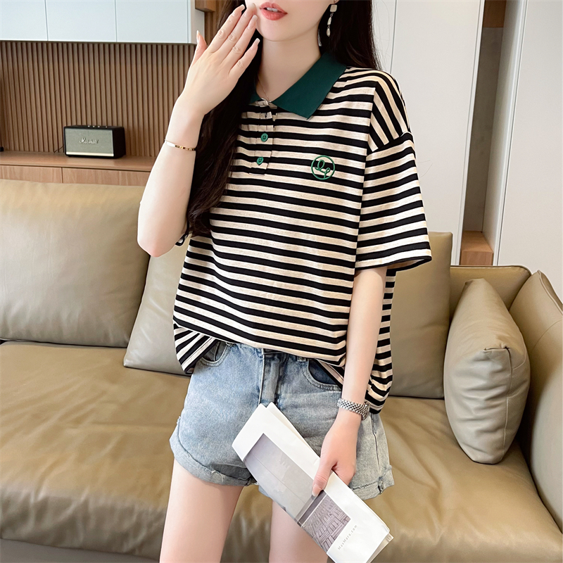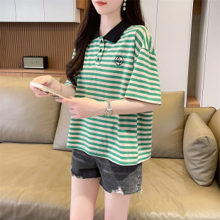 女装 polo领短袖 宽松大码 韩版 设计感小众条纹假两件上衣 t恤女夏季