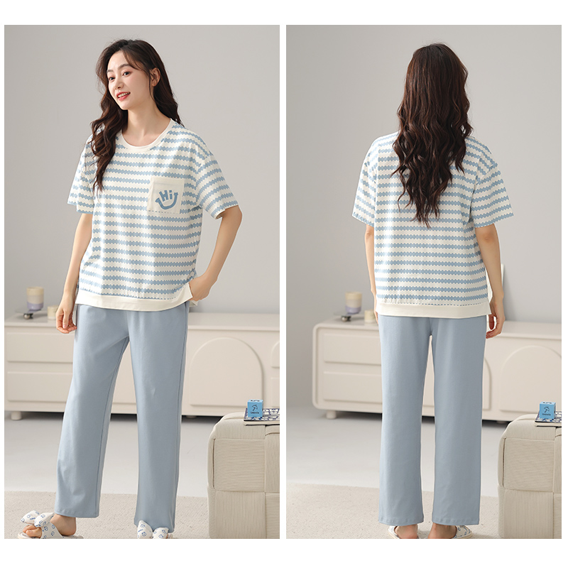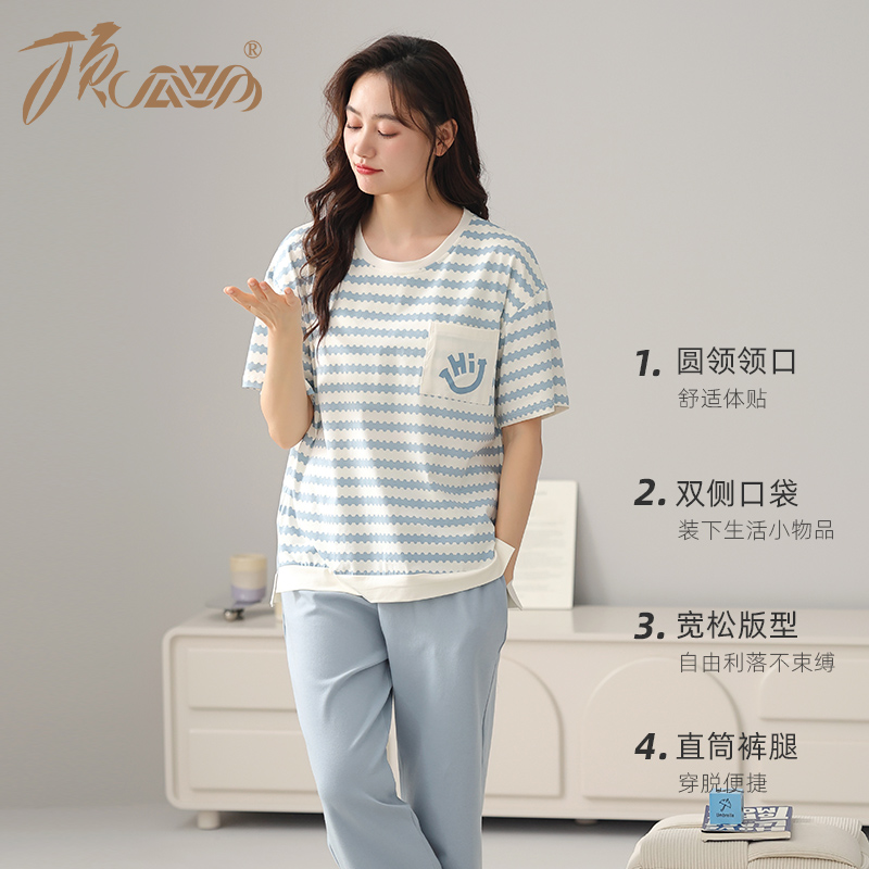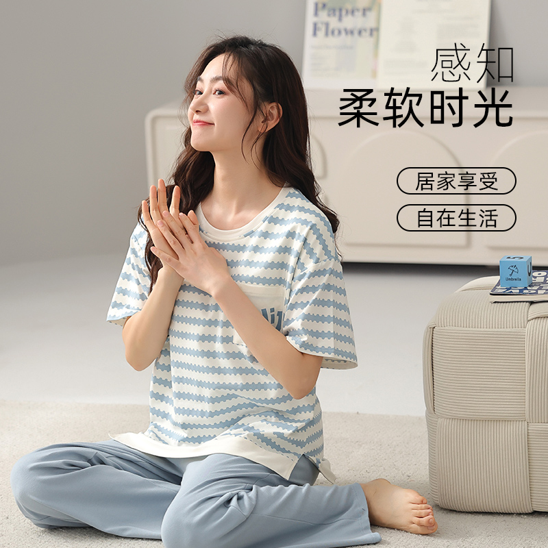 圆领休闲宽松可外穿家居服 长裤 顶瓜瓜带胸垫睡衣女夏纯棉薄款 短袖