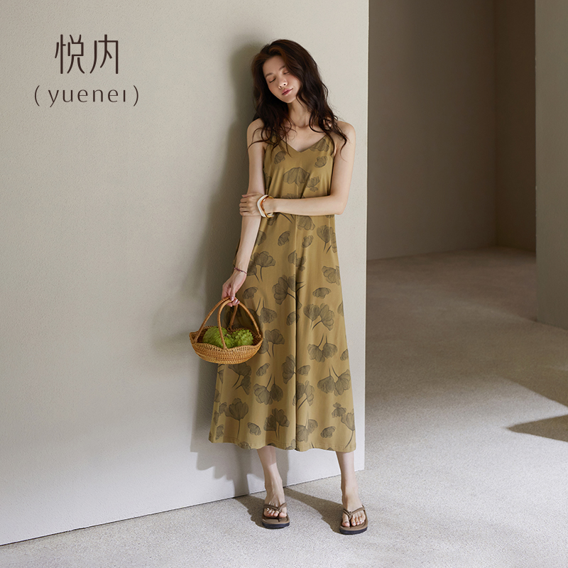 连衣裙休闲可外穿 夏天长款 悦内带胸垫睡裙女睡衣夏季 纯棉吊带夏款