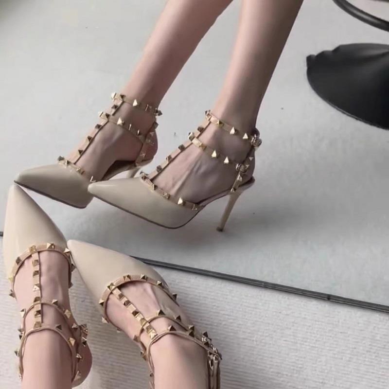 浅口绝美黑色单鞋 2025夏季 女凉鞋 尖头裸色铆钉高跟鞋 柳丁细跟 新款