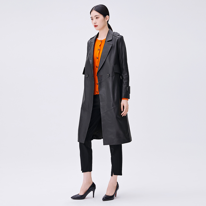 潮酷经典 皮衣外套时尚 马天奴秋冬黑色翻领长款 气质女装 绵羊皮