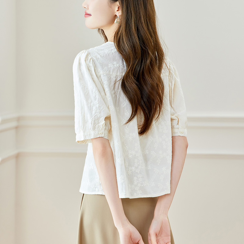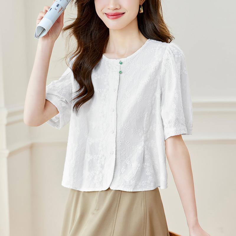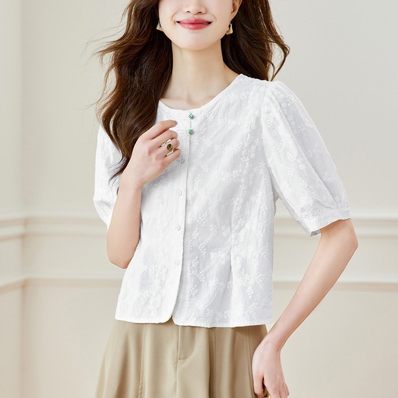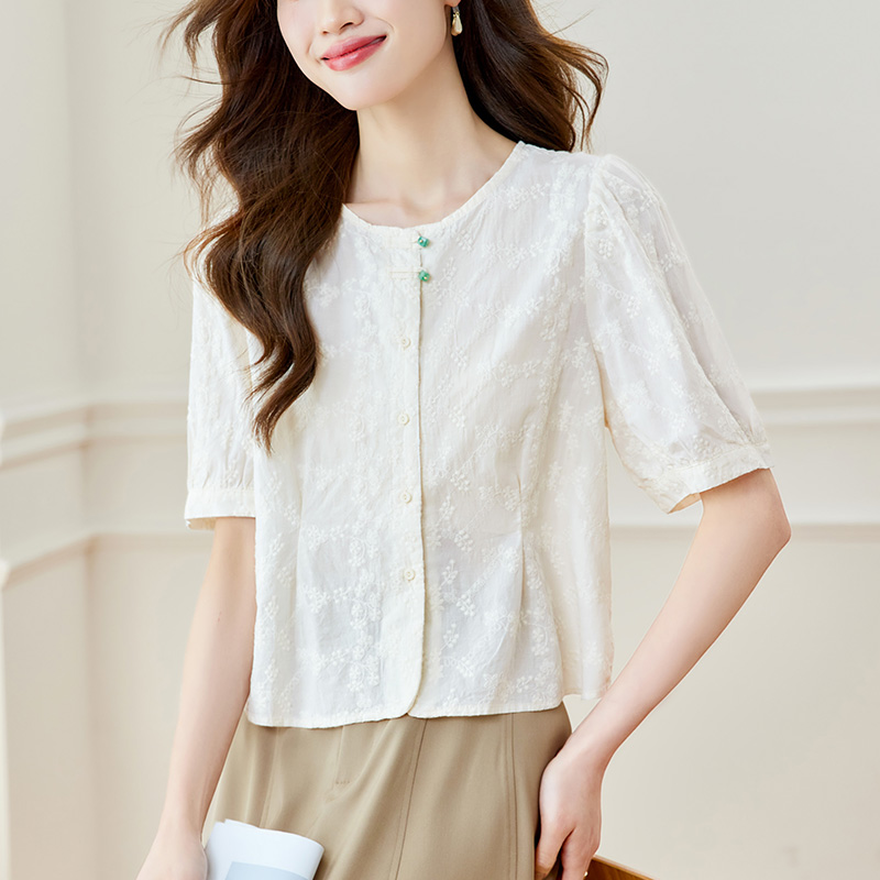 新款 初影 刺绣国风盘扣上衣2025夏季 女短袖 轻熟风衬衣 圆领衬衫