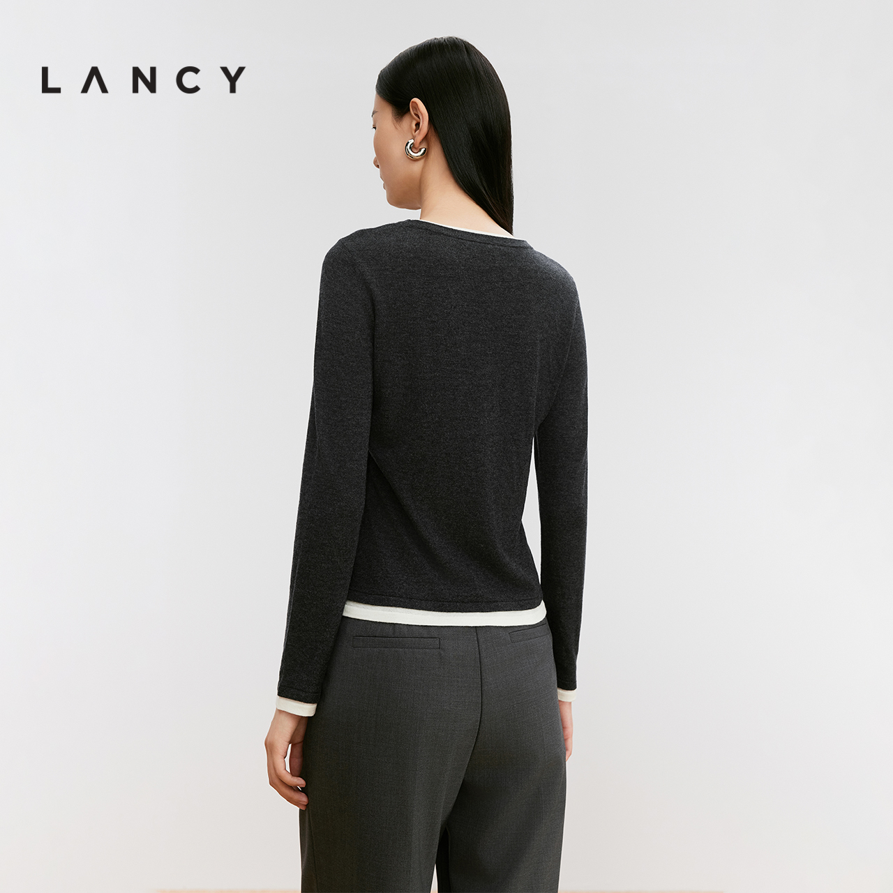撞色圆领简约气质针织衫 朗姿2024年冬新款 LANCY 女 美丽诺羊毛