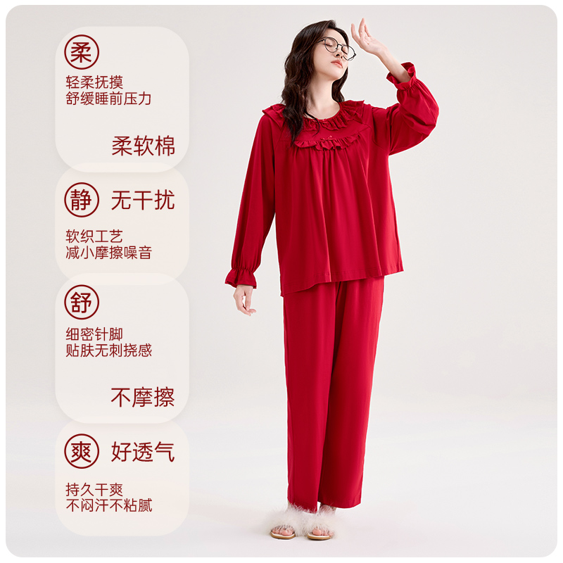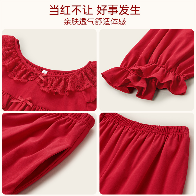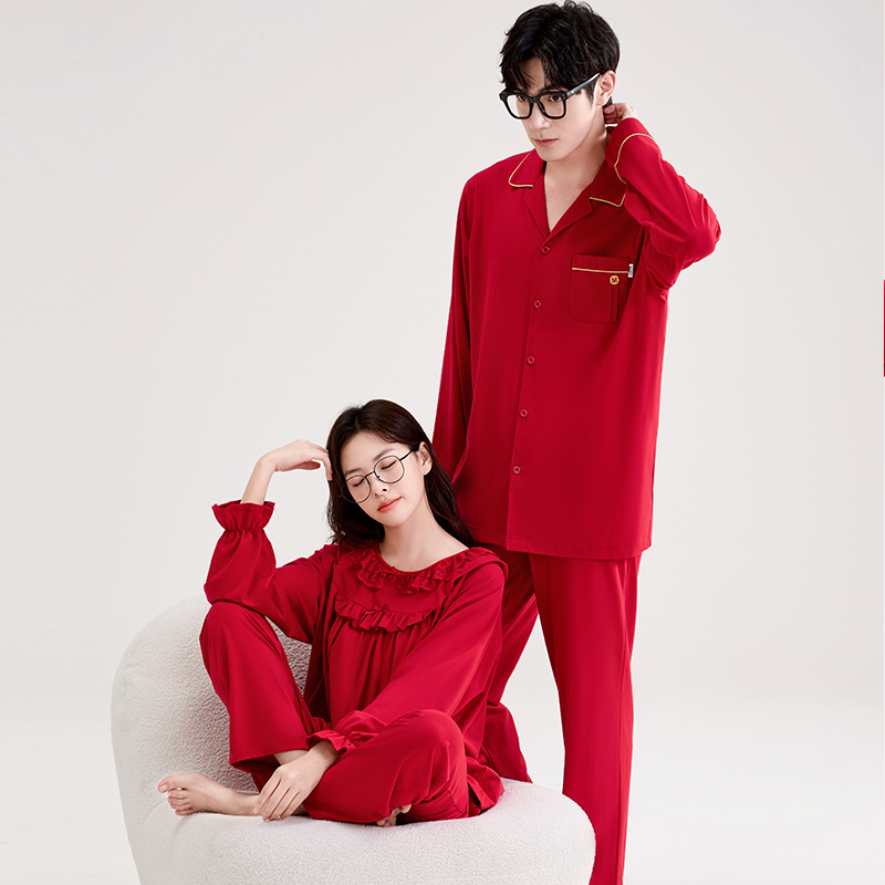本命年套装 大码 结婚新婚情侣纯棉家居服男士 芬腾红色睡衣女春秋款