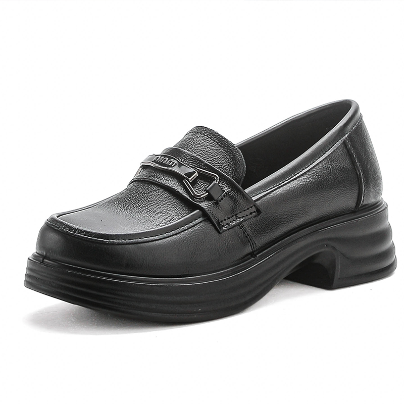 粗跟黑色马衔扣英伦风小皮鞋 真皮牛皮乐福鞋 妈妈鞋 女秋季 中跟单鞋