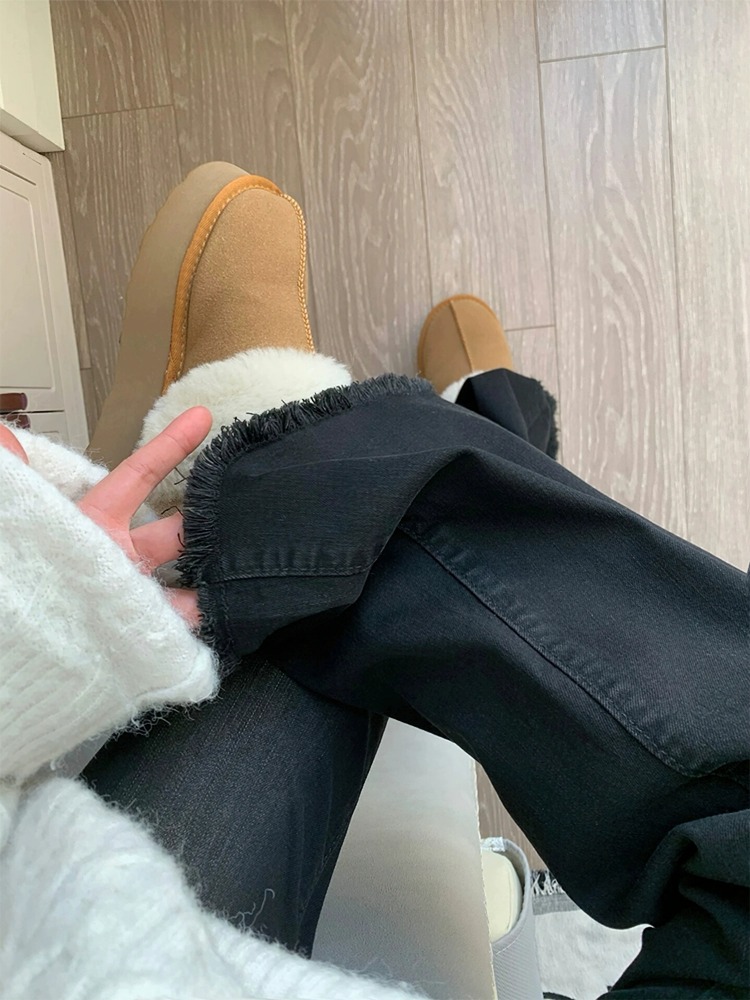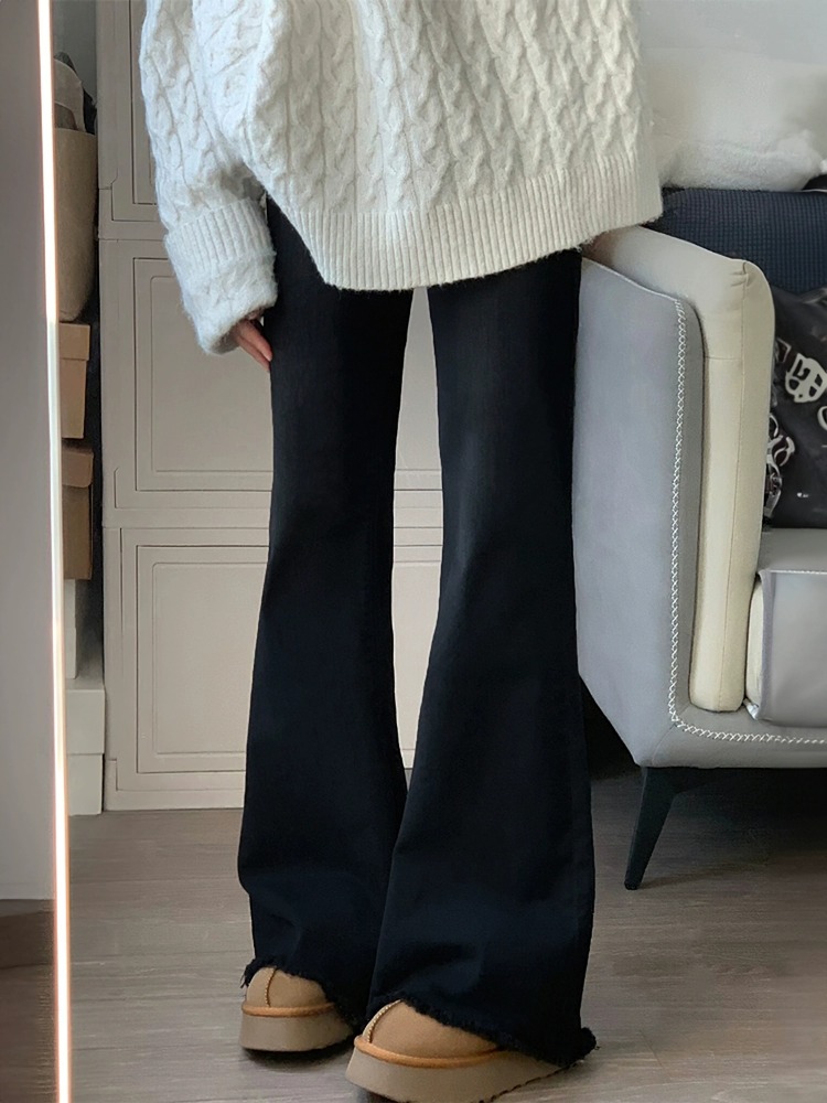子 女2025加绒显瘦穿搭直筒阔腿长裤 自然涩秋冬季 侧拉链黑色牛仔裤