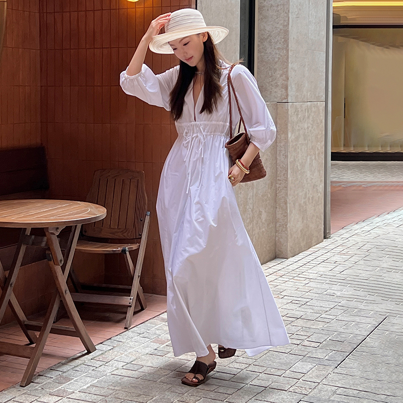 收腰白色法式 MAMC拼接格纹灯笼袖 长袖 新款 裙子 抹胸连衣裙2025秋季