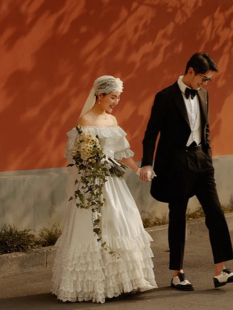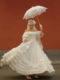 2024新款 复古民国风喜嫁古典蕾丝花边一字肩白纱轻婚纱礼服摄影服