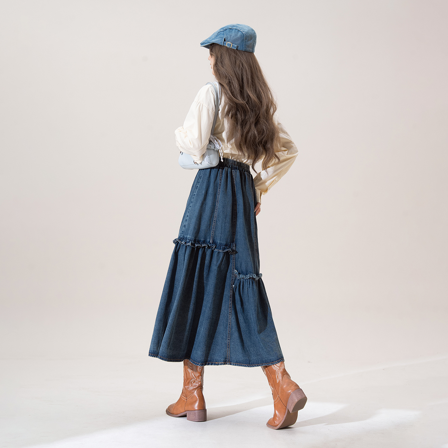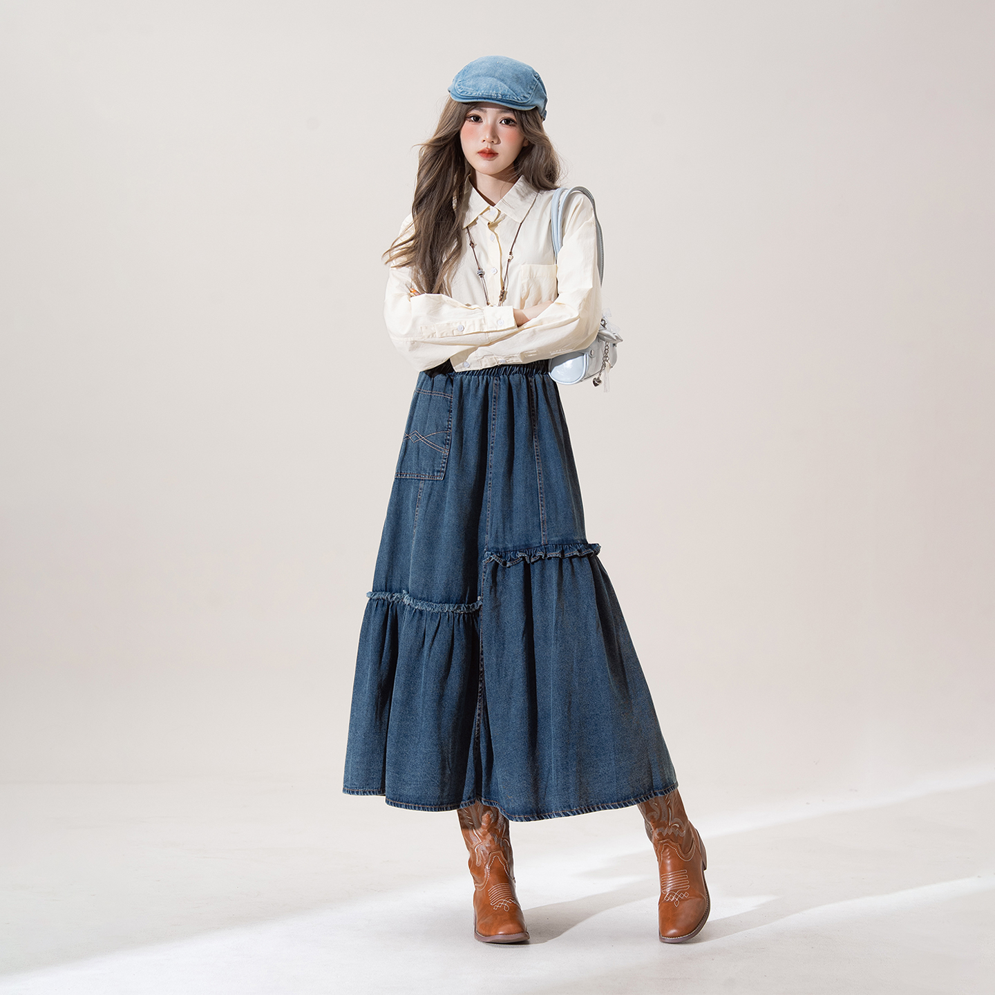 深蓝色不规则牛仔半身裙女秋季 木耳边拼接宽松显瘦A字长裙子 新款