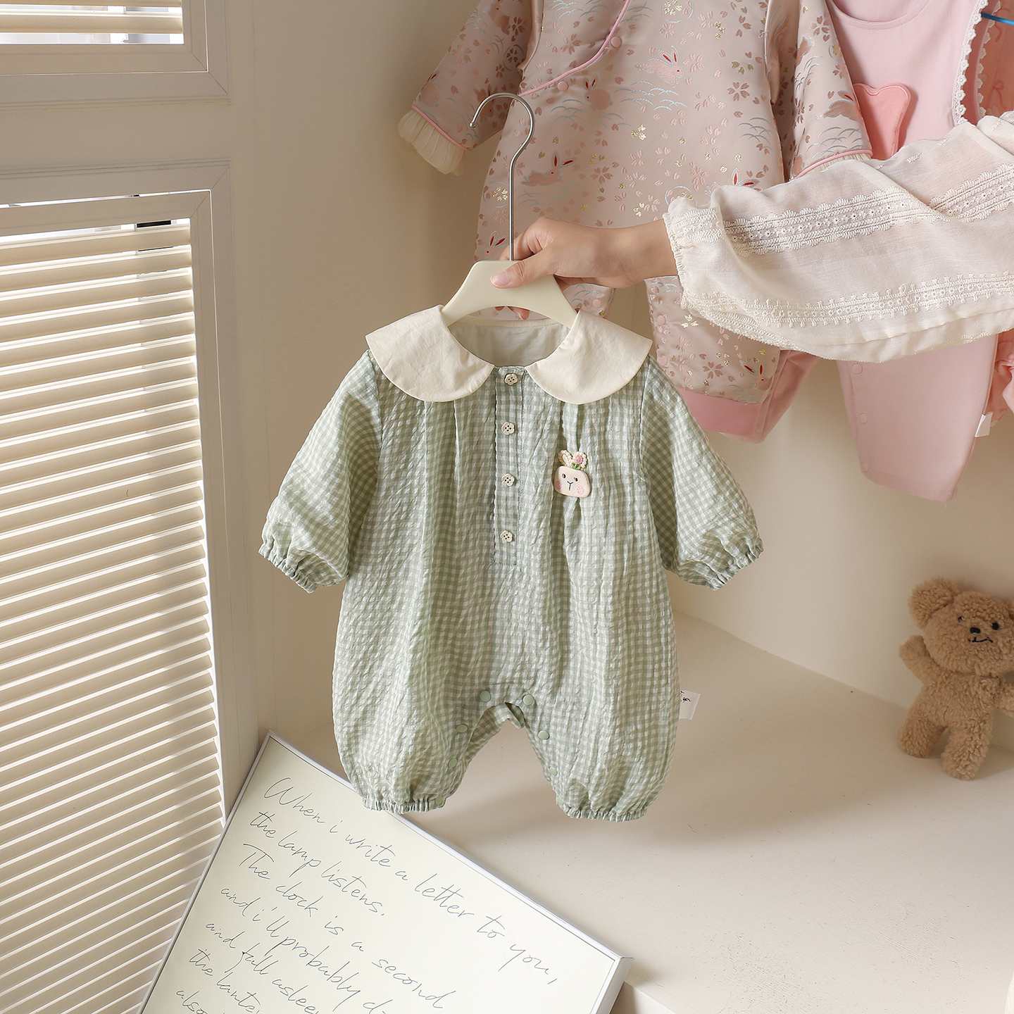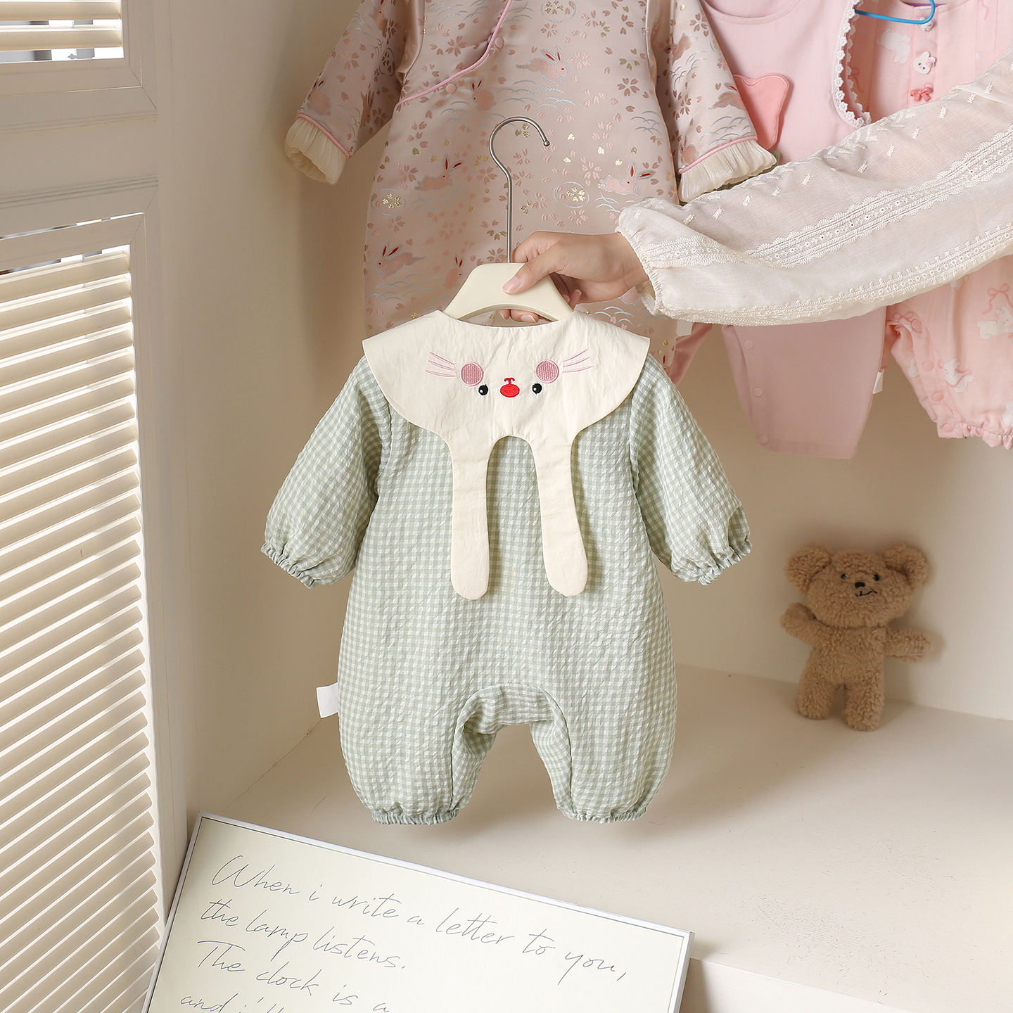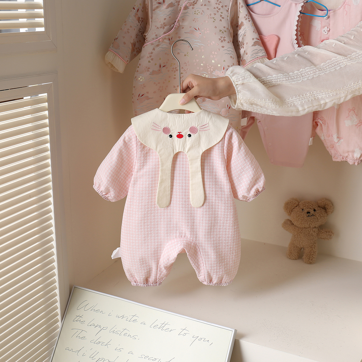 外出爬服 满月长袖 新生儿婴儿春秋装 连体衣女宝宝格子小兔哈衣秋季