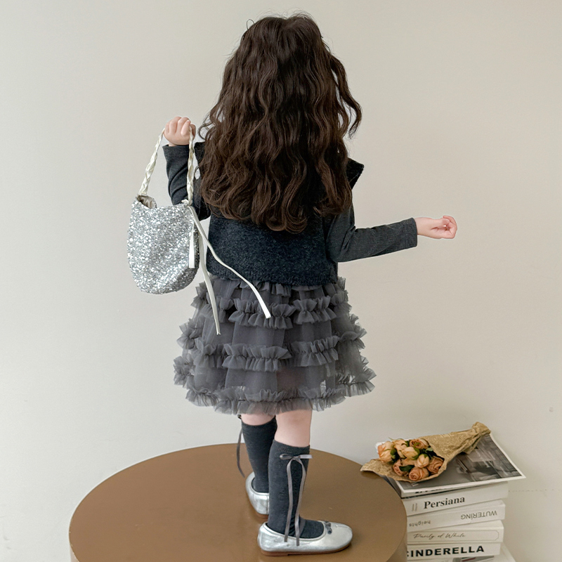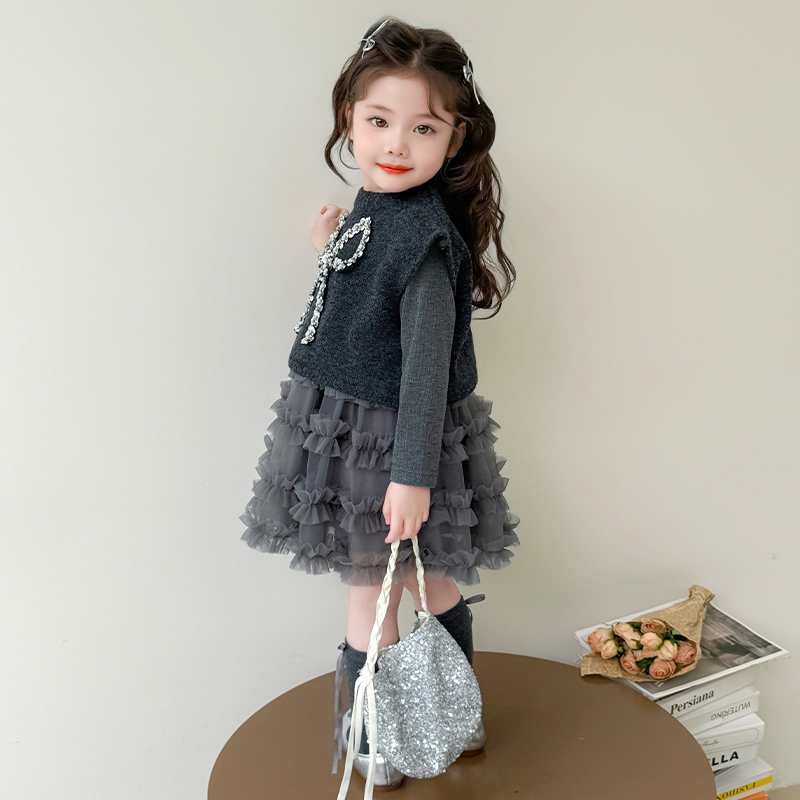 网纱蛋糕裙女宝宝时髦蝴蝶结马甲两件套 儿童长袖 女童秋季 裙子套装