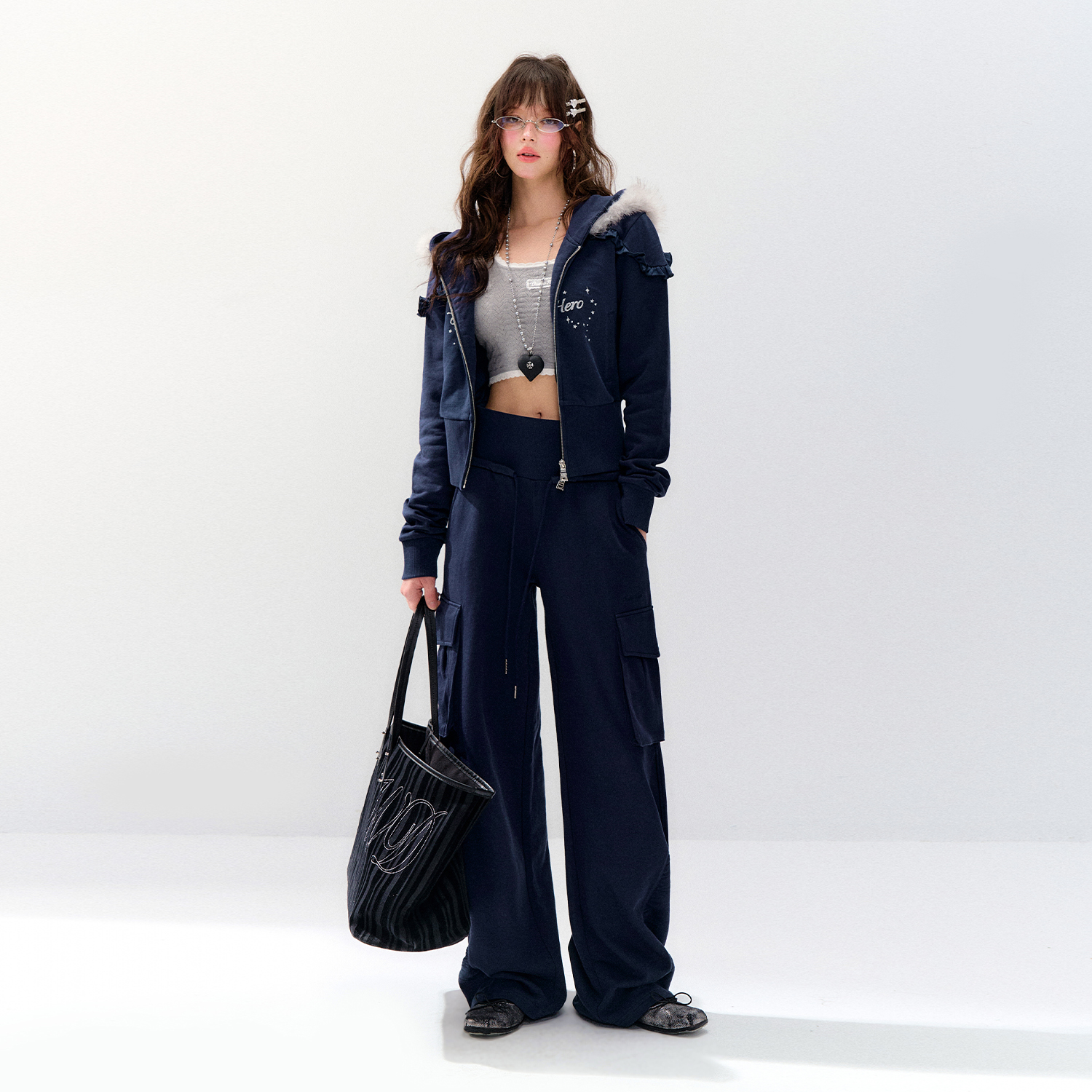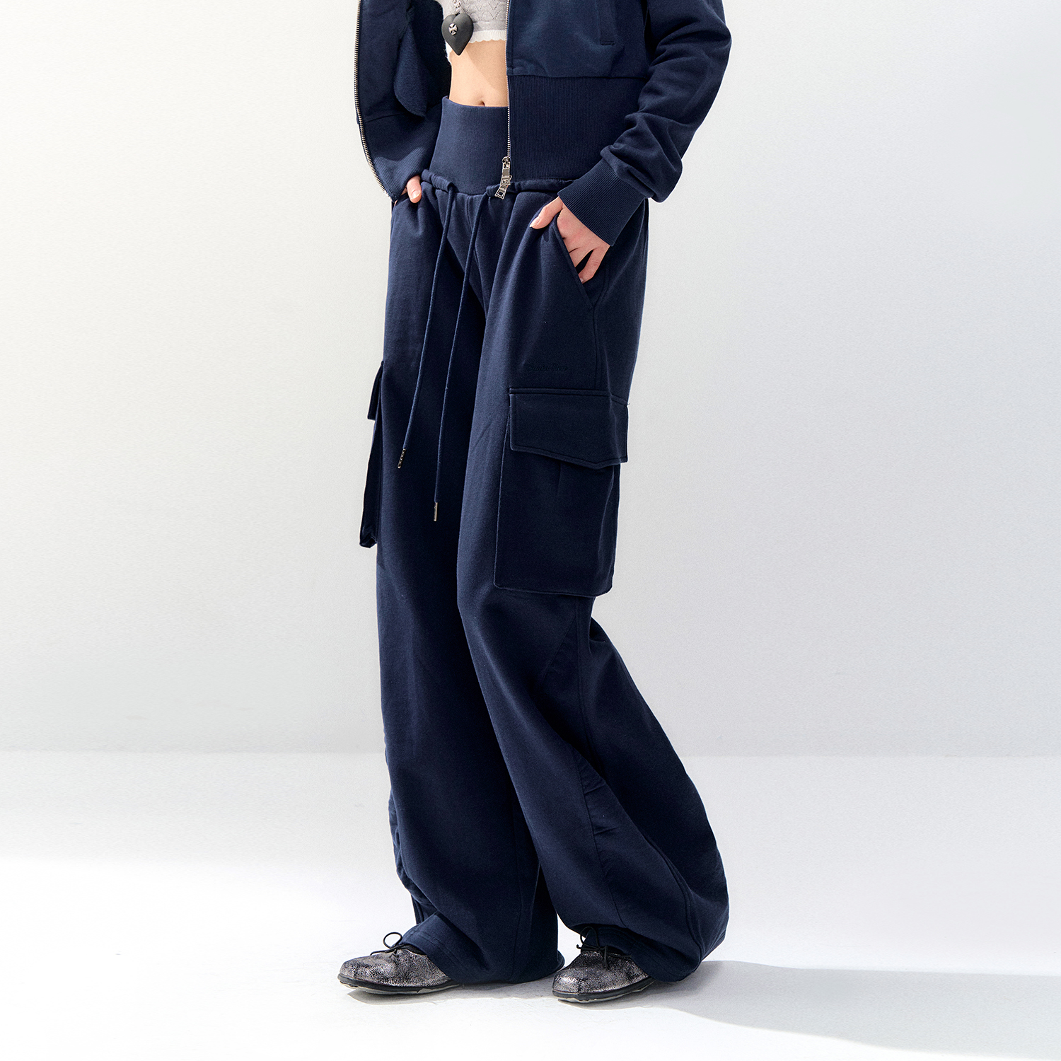 宽松直筒阔腿运动裤 新款 子 女秋季 藏青色苹果刺绣高腰抽绳休闲卫裤