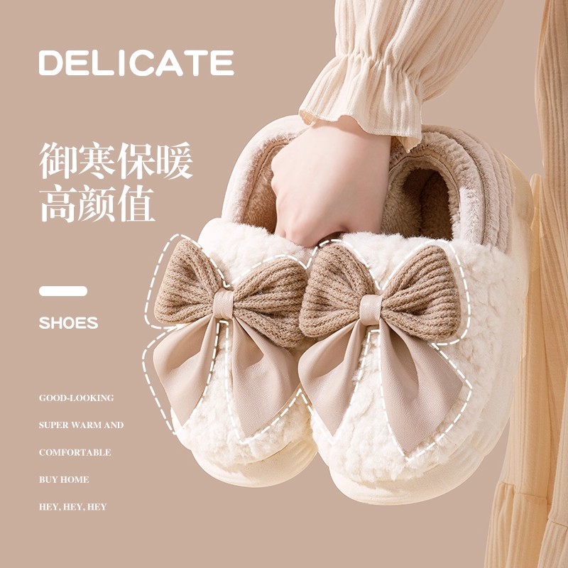 厚底棉鞋 可爱包跟保暖家居室内防滑毛绒秋冬季 女冬款 蝴蝶结棉拖鞋