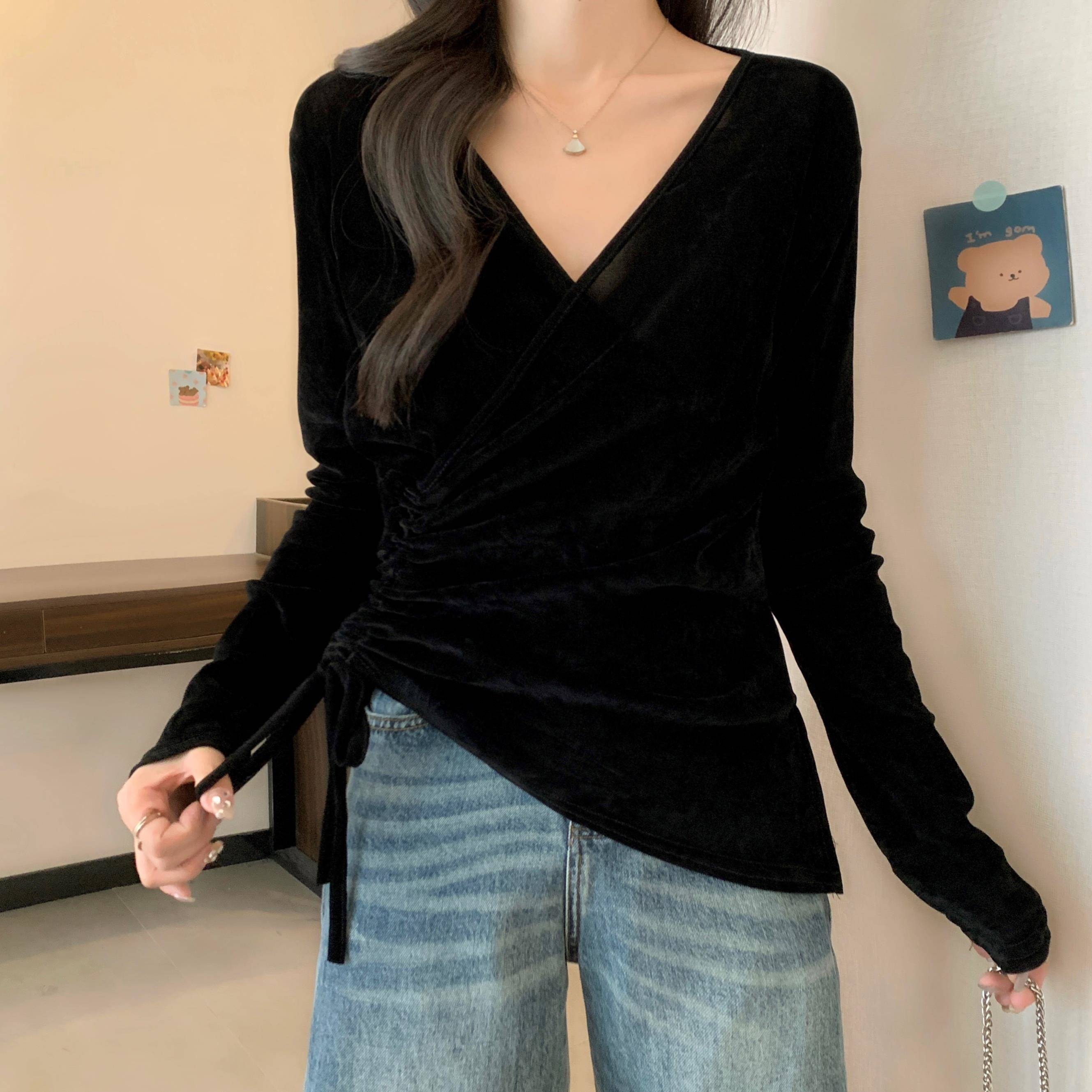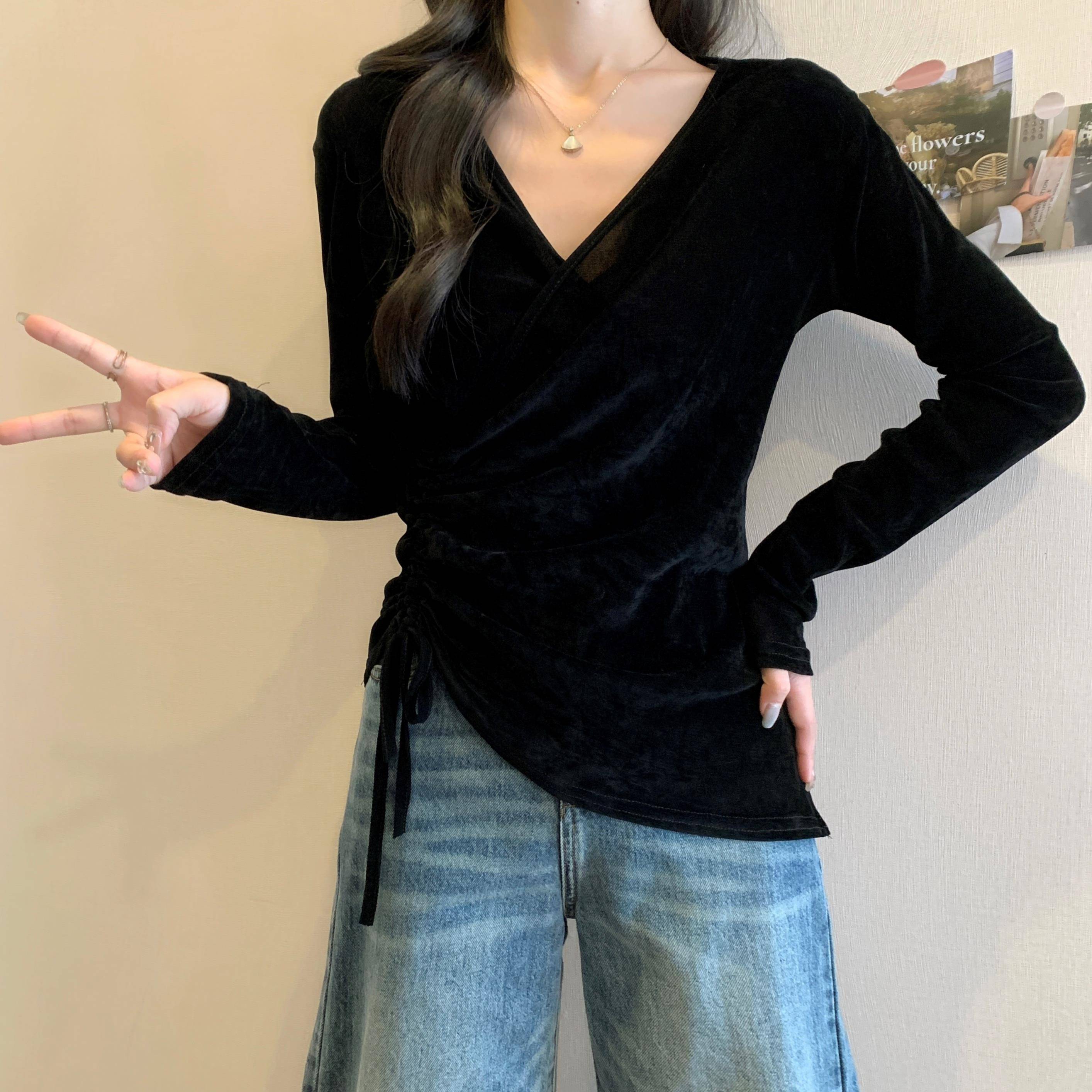 t恤1012z 女胖mm显瘦遮肚v领长袖 秋冬独漂亮金丝绒打底衫 2025大码