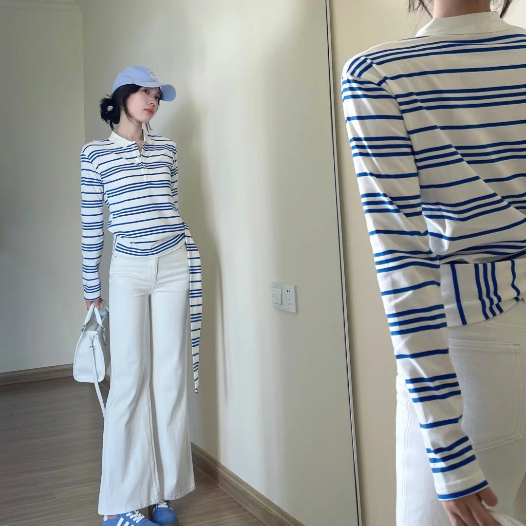 内搭打底衫 修身 条纹上衣服 T恤女早秋韩版 辣妹绑带收腰Polo领长袖
