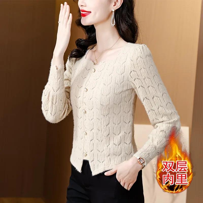 时尚 气质修身 显瘦洋气长1007k 加绒衫 秋冬打底内搭方领蕾丝衬衫