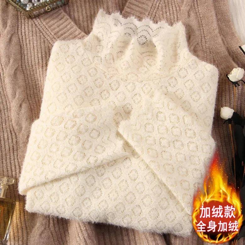 洋气镂空网纱1007k 女新款 秋冬打底内搭薄款 加绒高领磨毛蕾丝衫