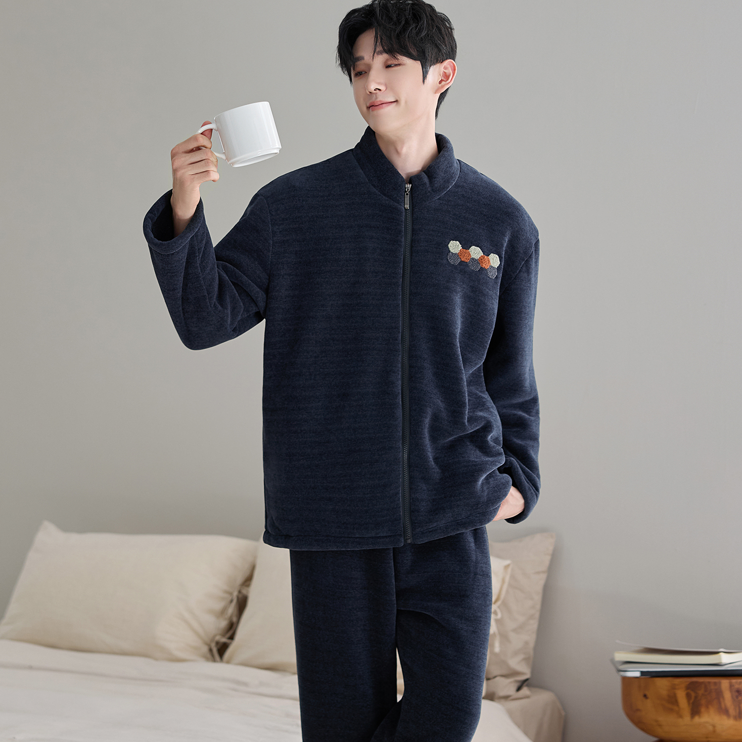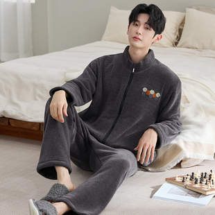 家居服套装 睡衣男冬季 法兰绒男士 男款 加厚加绒双面珊瑚绒拉链大码
