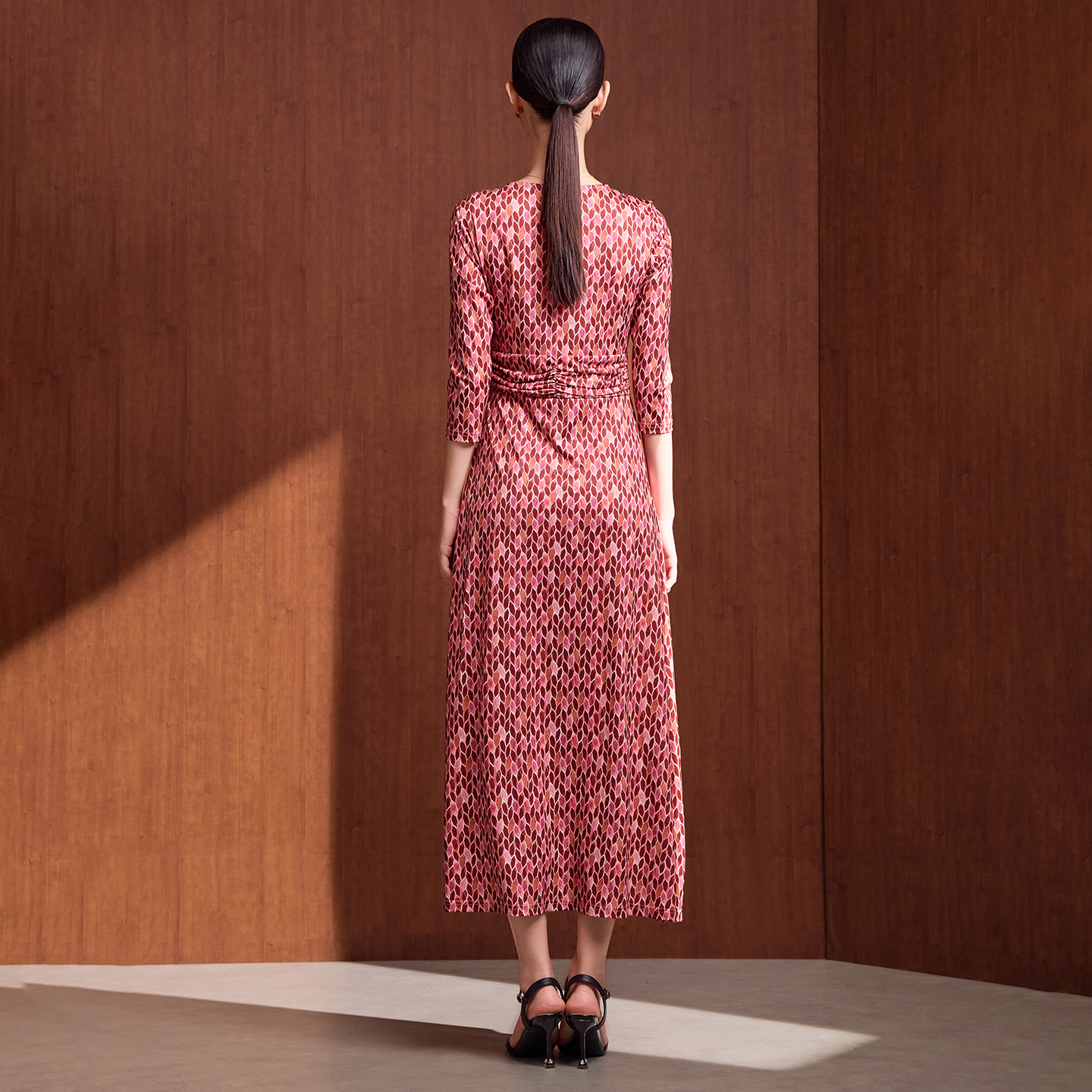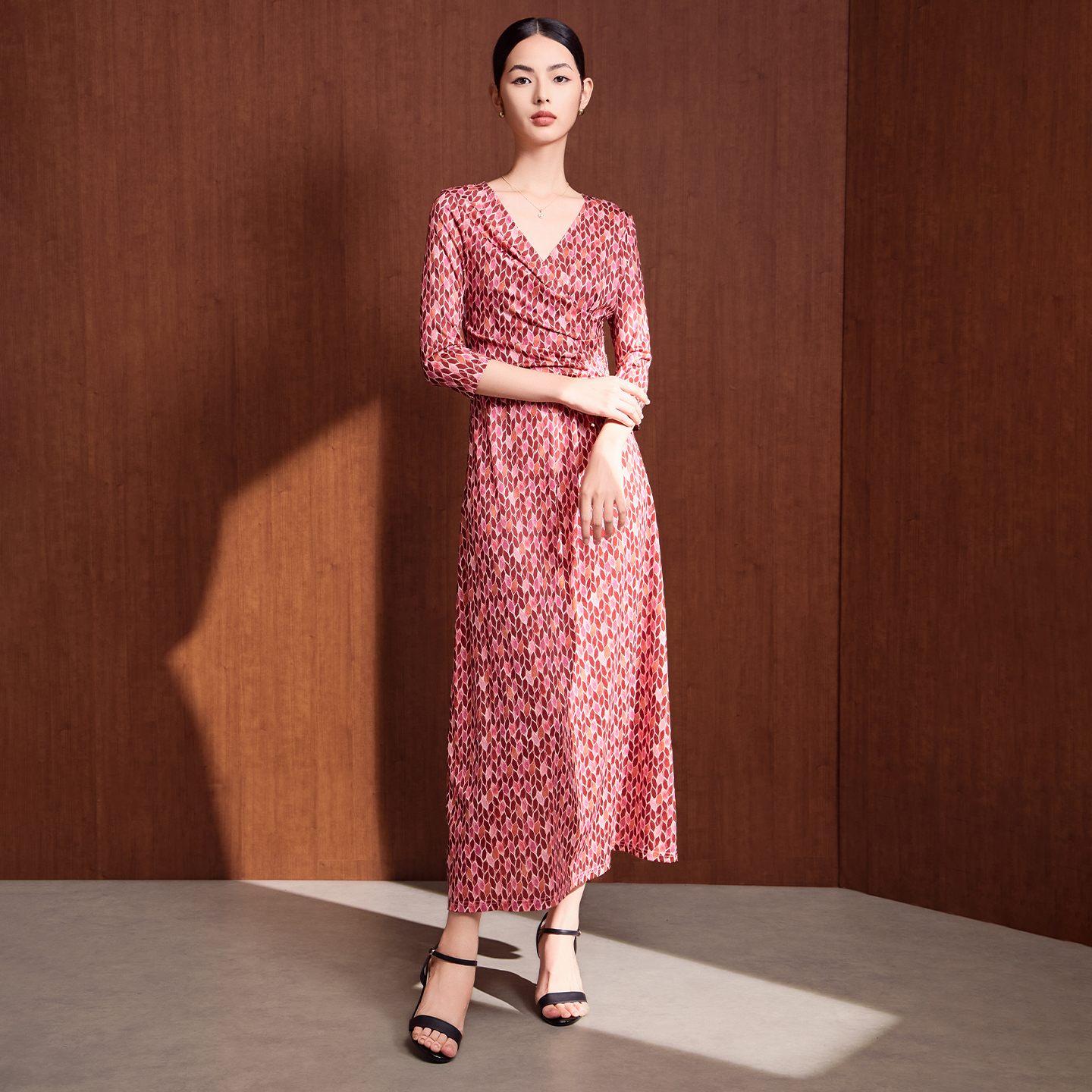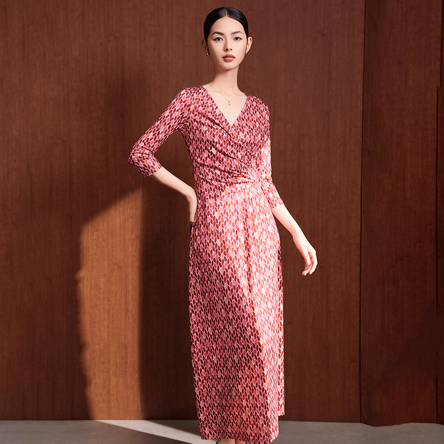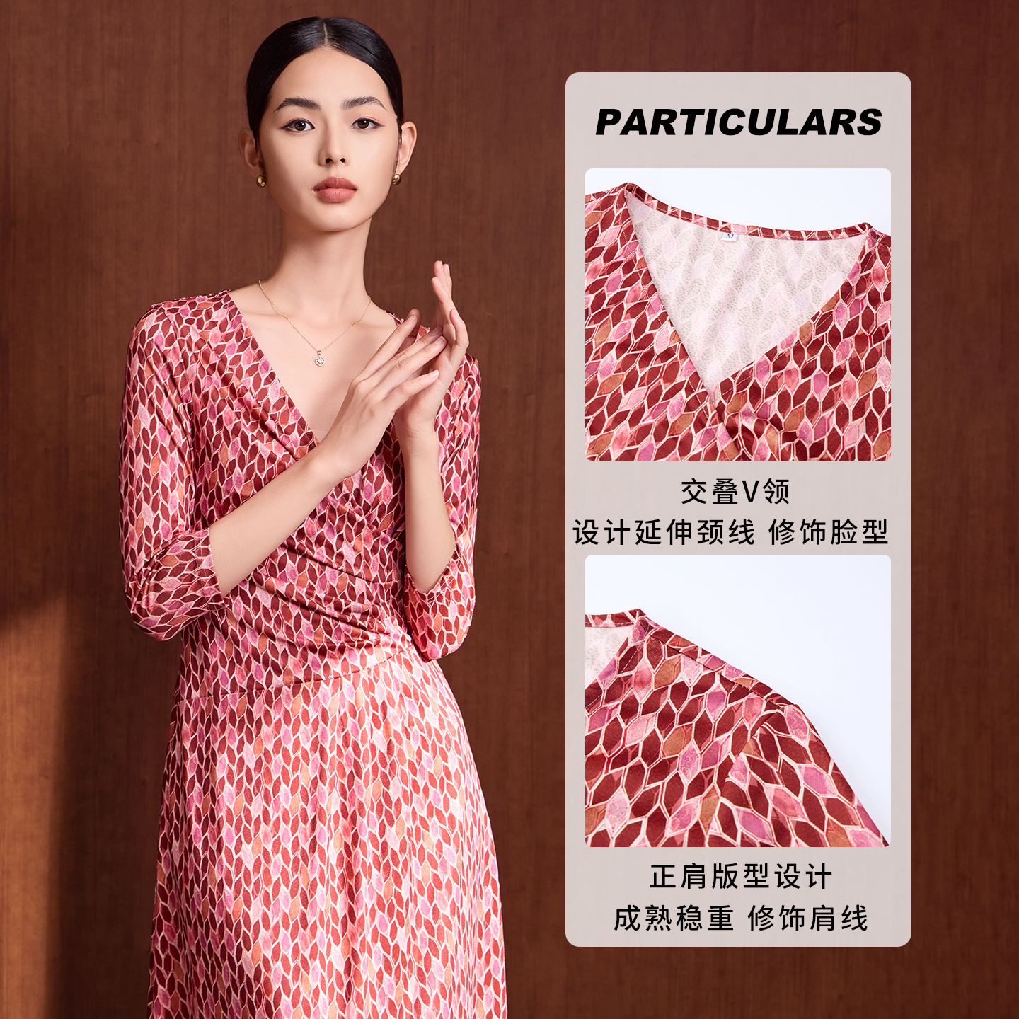 马天奴2025秋冬新款 红色印花V领绑带收腰连衣裙子长裙气质度假女