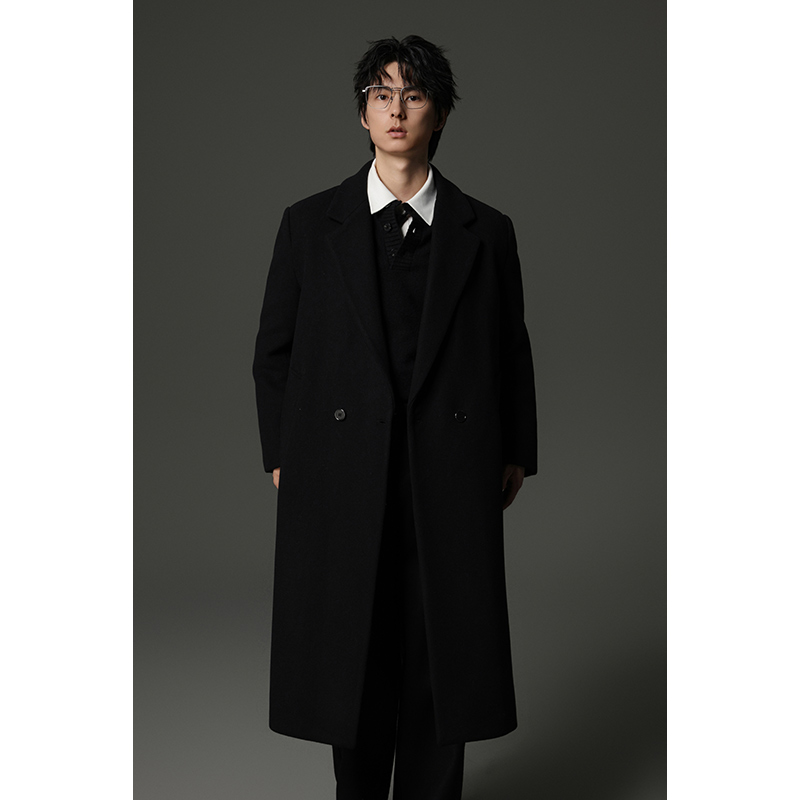 韩版 长款 呢子加厚风衣外套 2025春秋季 V37黑色高级感毛呢大衣男款