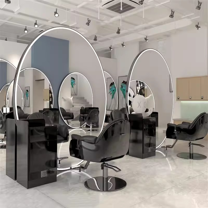 网红大圆镜美发店镜台单双面落地剪发烫染镜理发店发廊专用带柜子