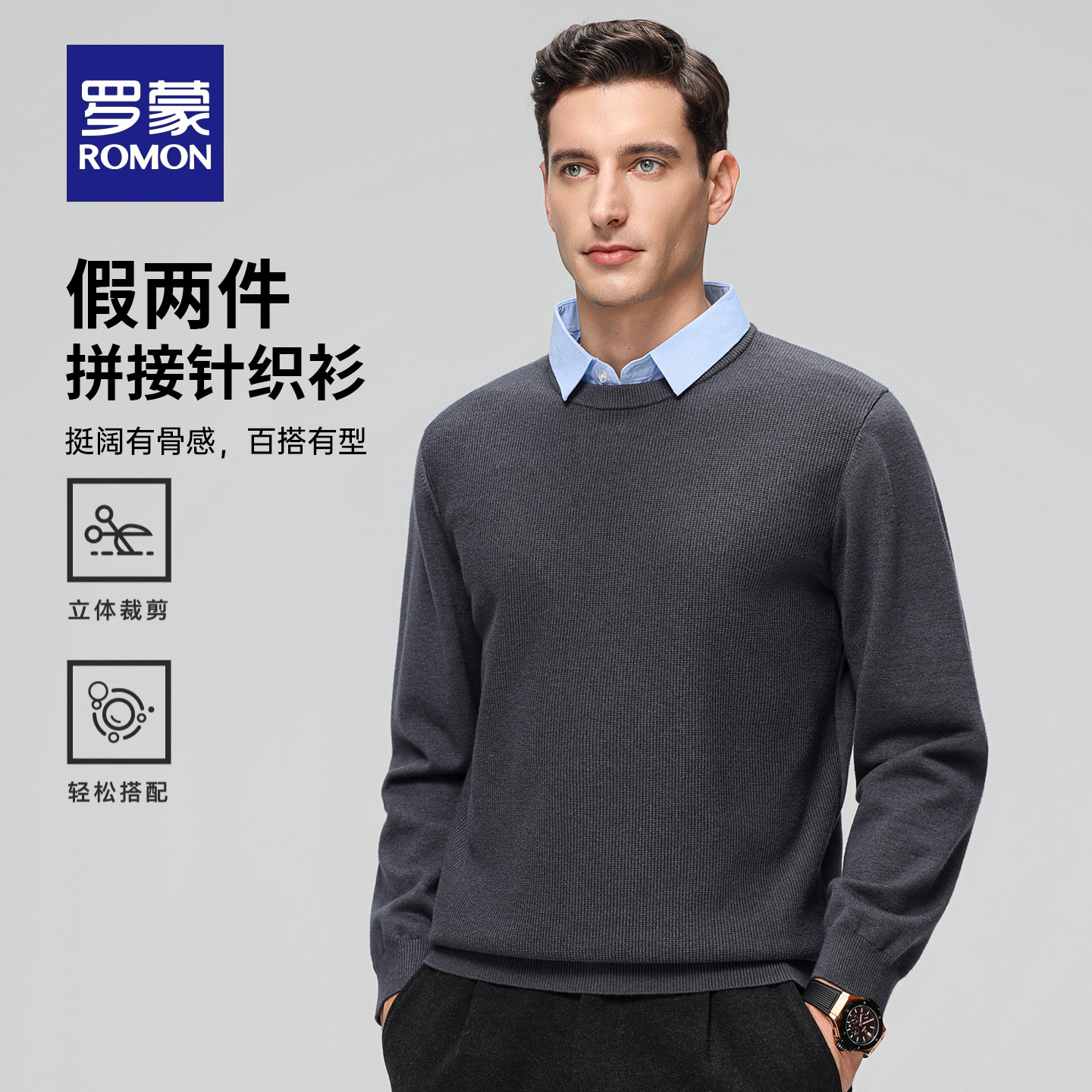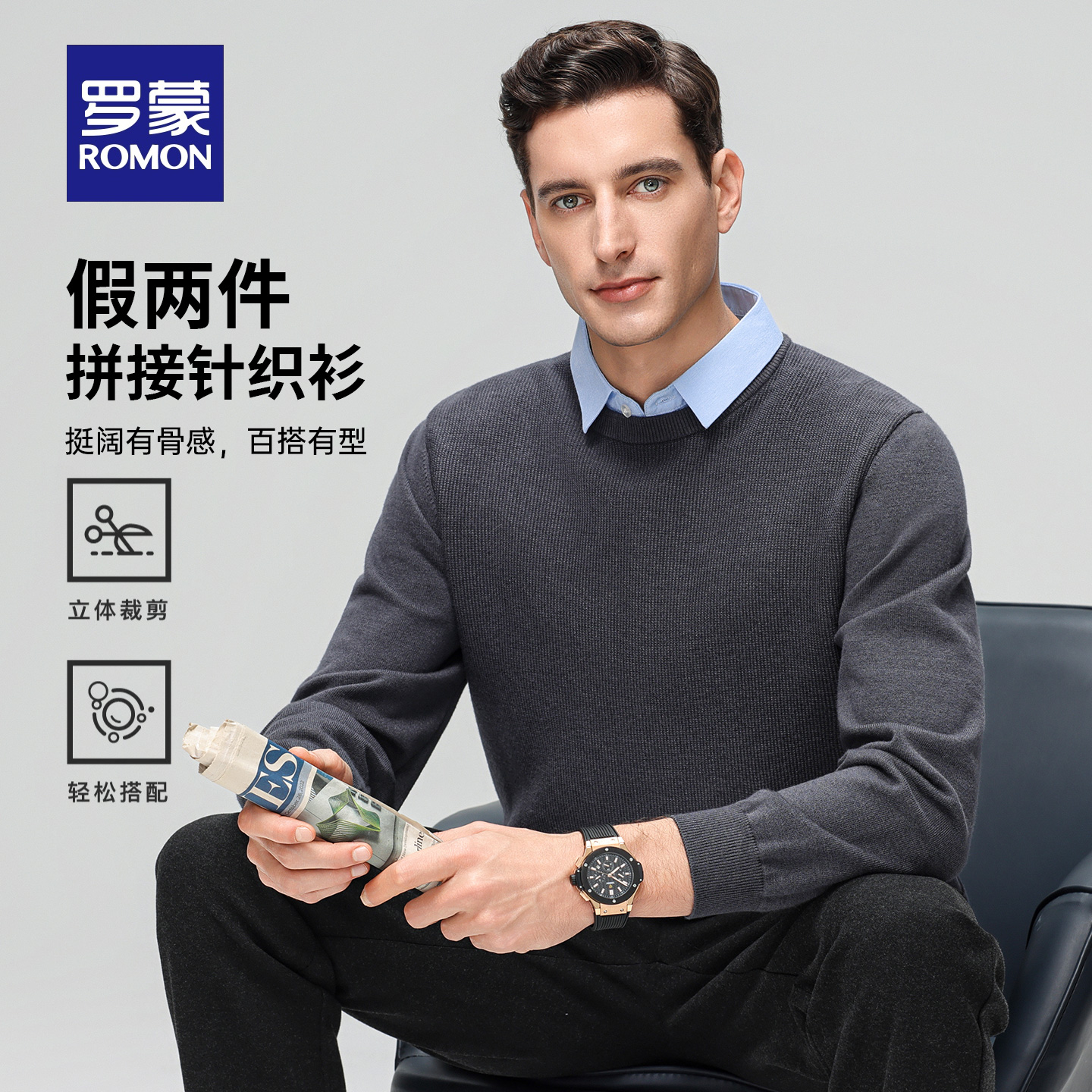 新款 2025秋季 纯色百搭休闲保暖翻领毛衣 商务假两件针织衫 罗蒙男士