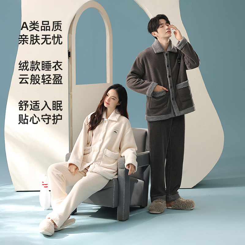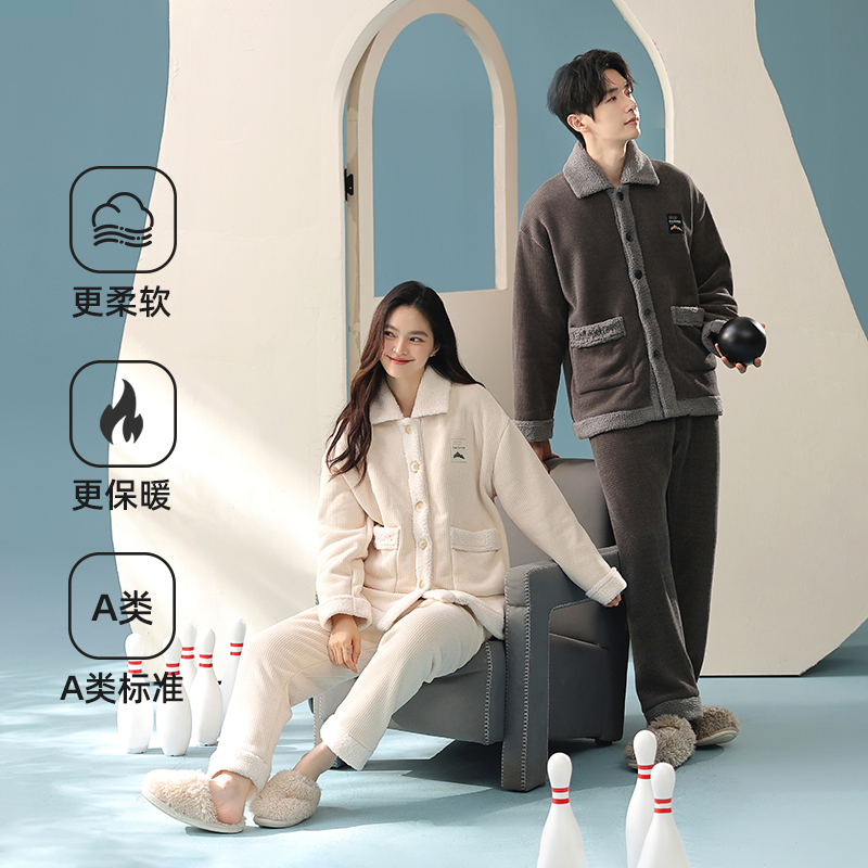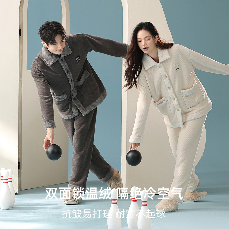 加绒加厚情侣睡衣2025秋冬新款 宽松 保暖女纯色一体绒家居服男款