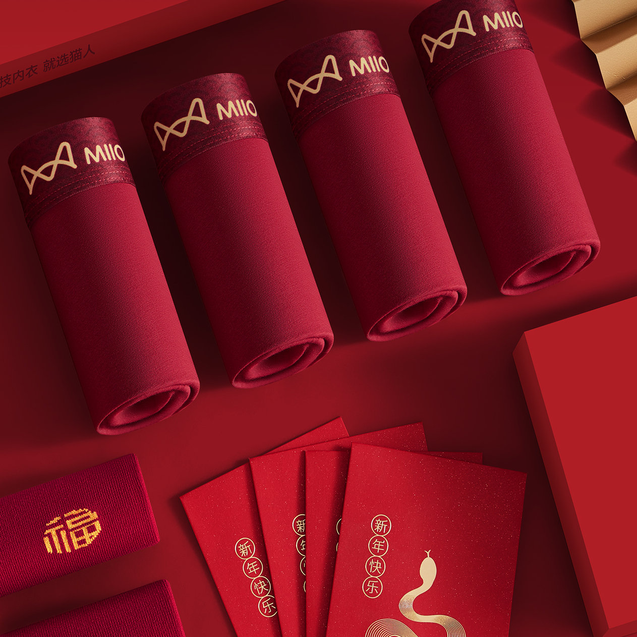 平角裤 猫人本命年男士 新款 鸿运大红纯棉四角短裤 蛇马新年礼物 内裤