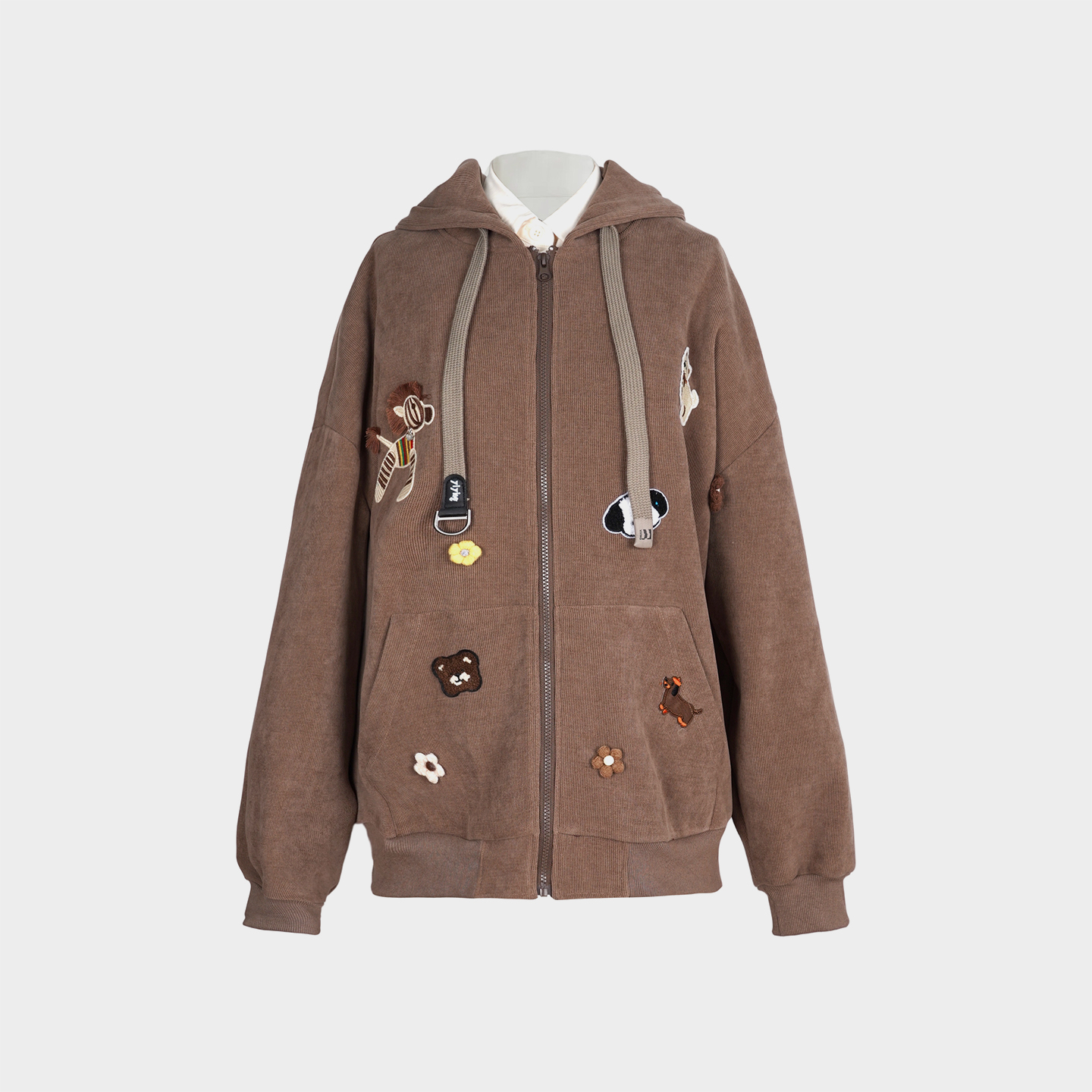 复古卡通刺绣连帽拉链连帽卫衣外套宽松休闲百搭 美式 25冬新品