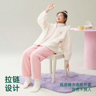 大码 春秋开衫 女士家居服 加厚珊瑚绒睡衣女冬法兰绒加绒套装 秋冬季