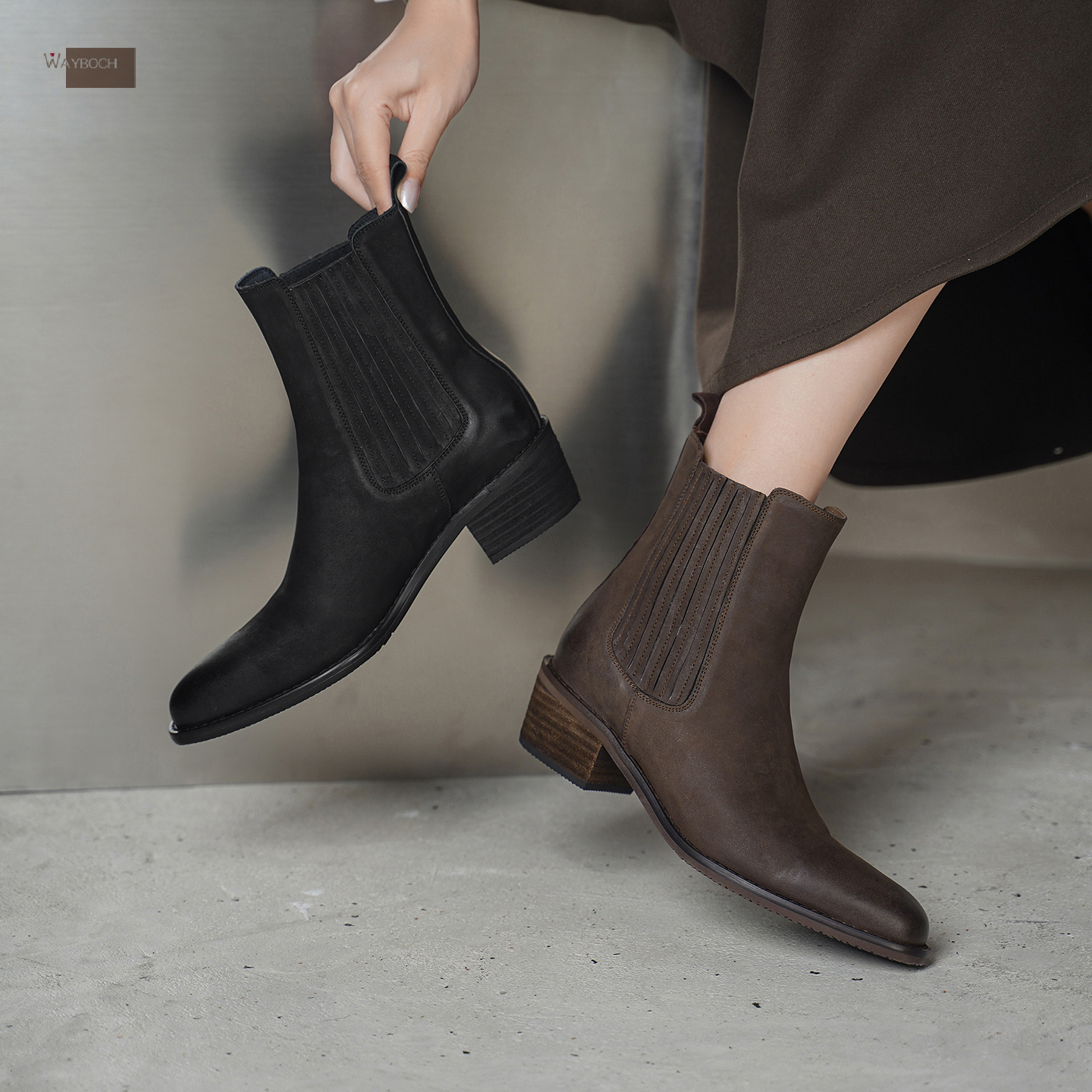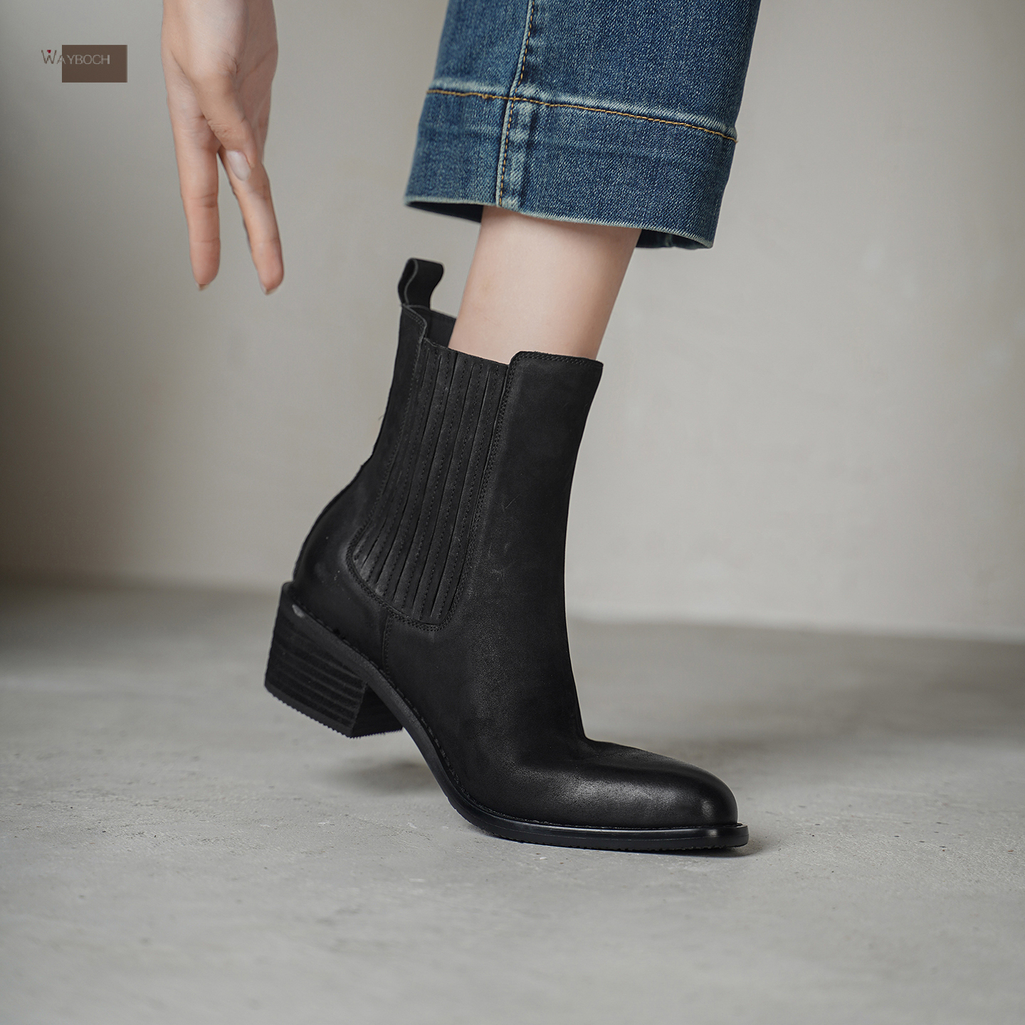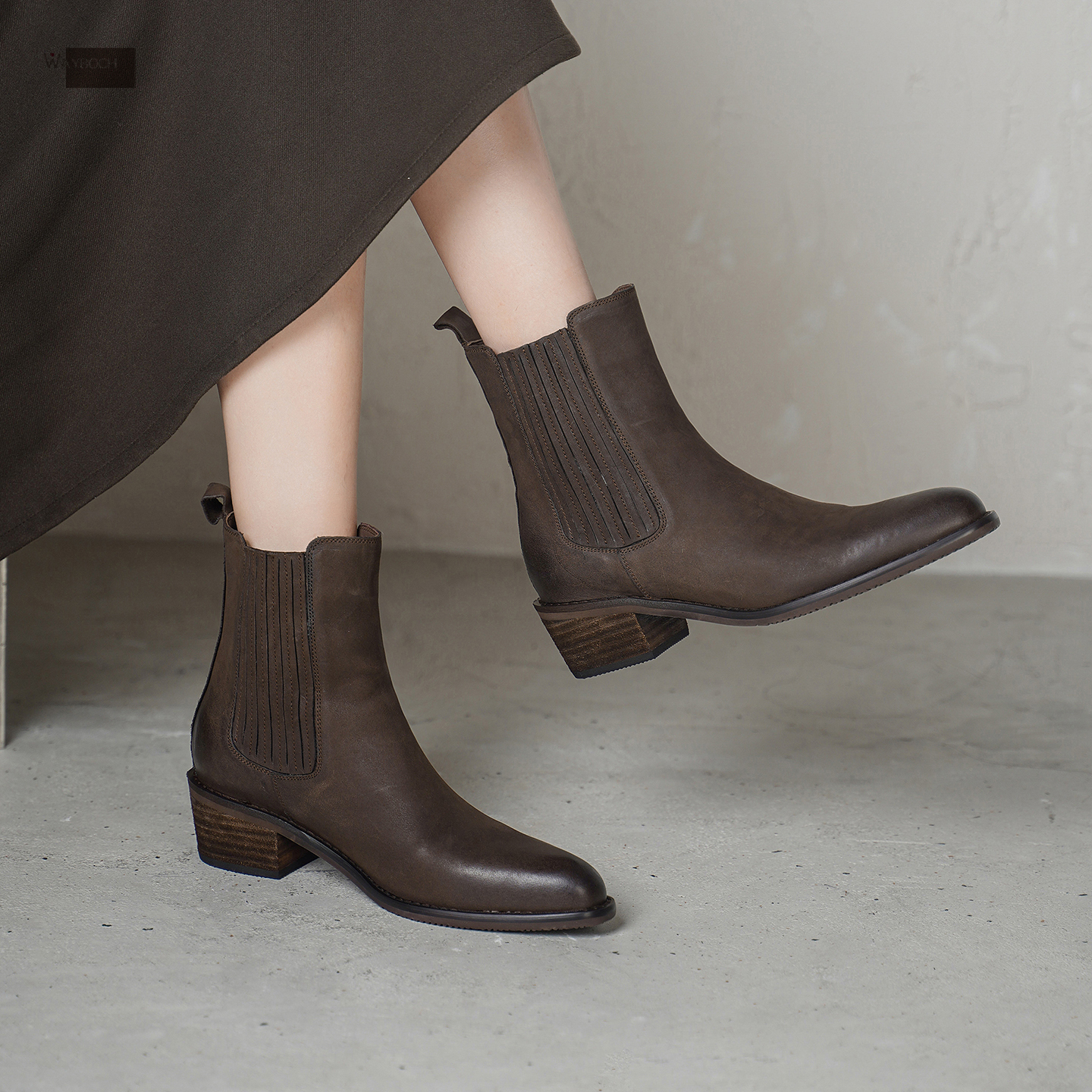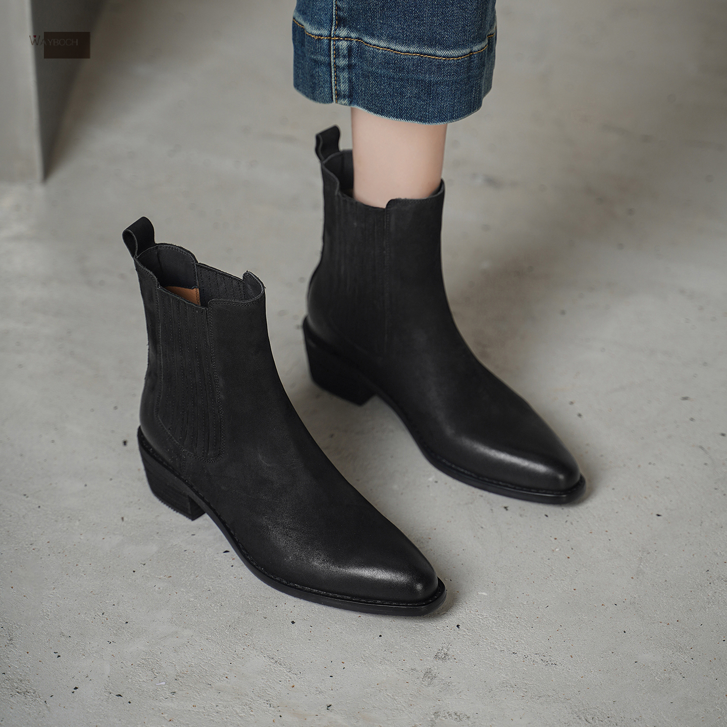 粗跟一脚蹬短筒短靴子冬 中跟尖头切尔西靴女 头层牛皮 真皮 玮保