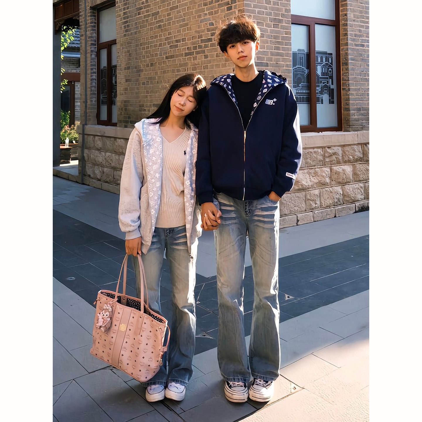 子高腰微喇裤 显瘦显腿长弯刀裤 男款 cleanfit穿搭蓝色闪电纹牛仔裤