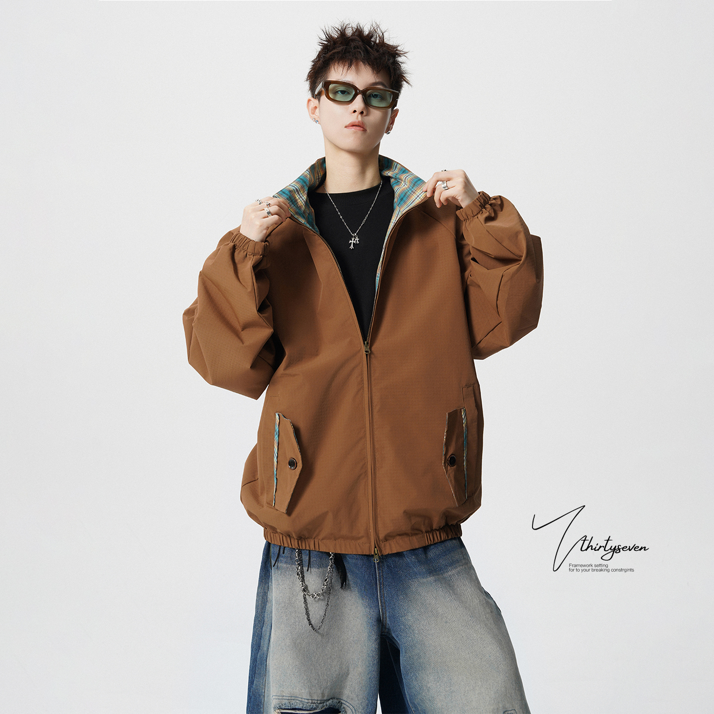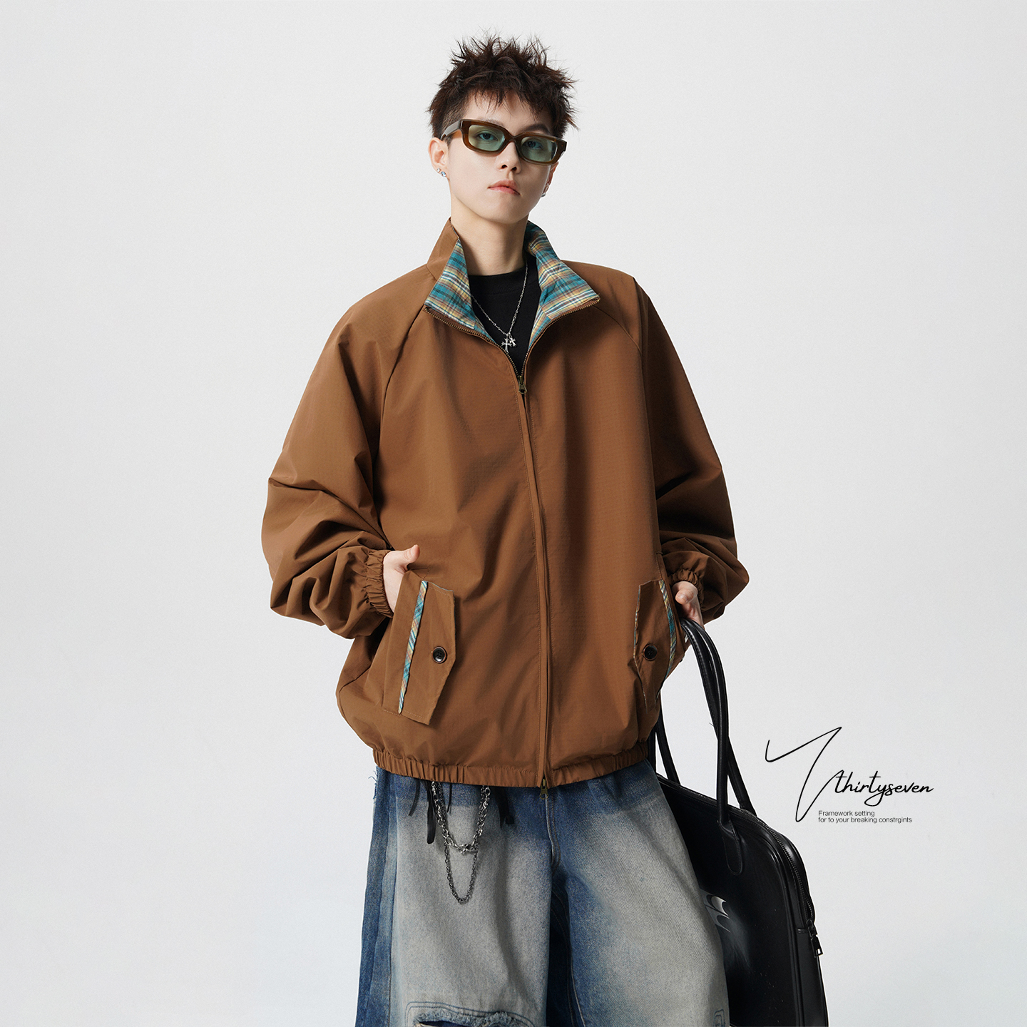 V37美式 潮牌格子拼接通勤休闲上衣 巴恩风黑色立领夹克外套男秋季