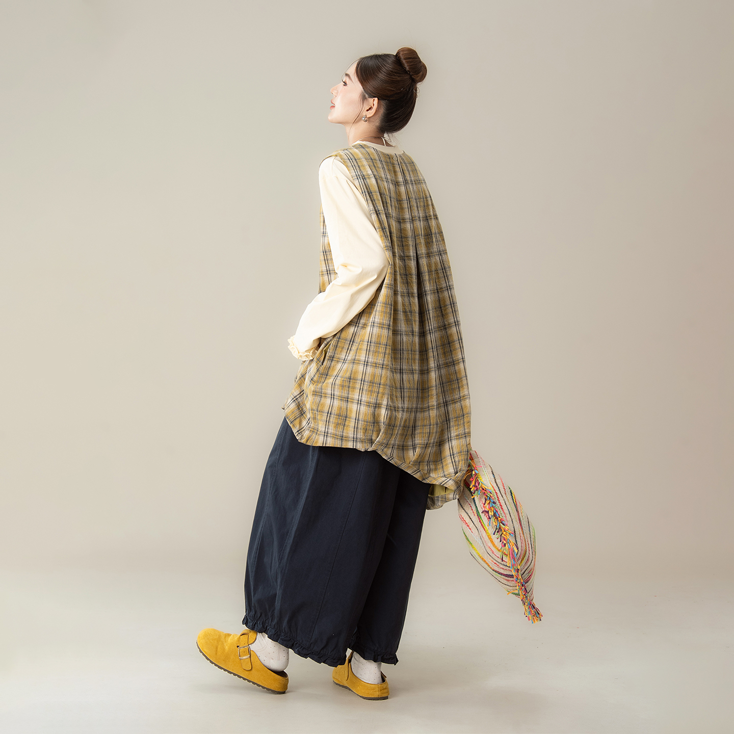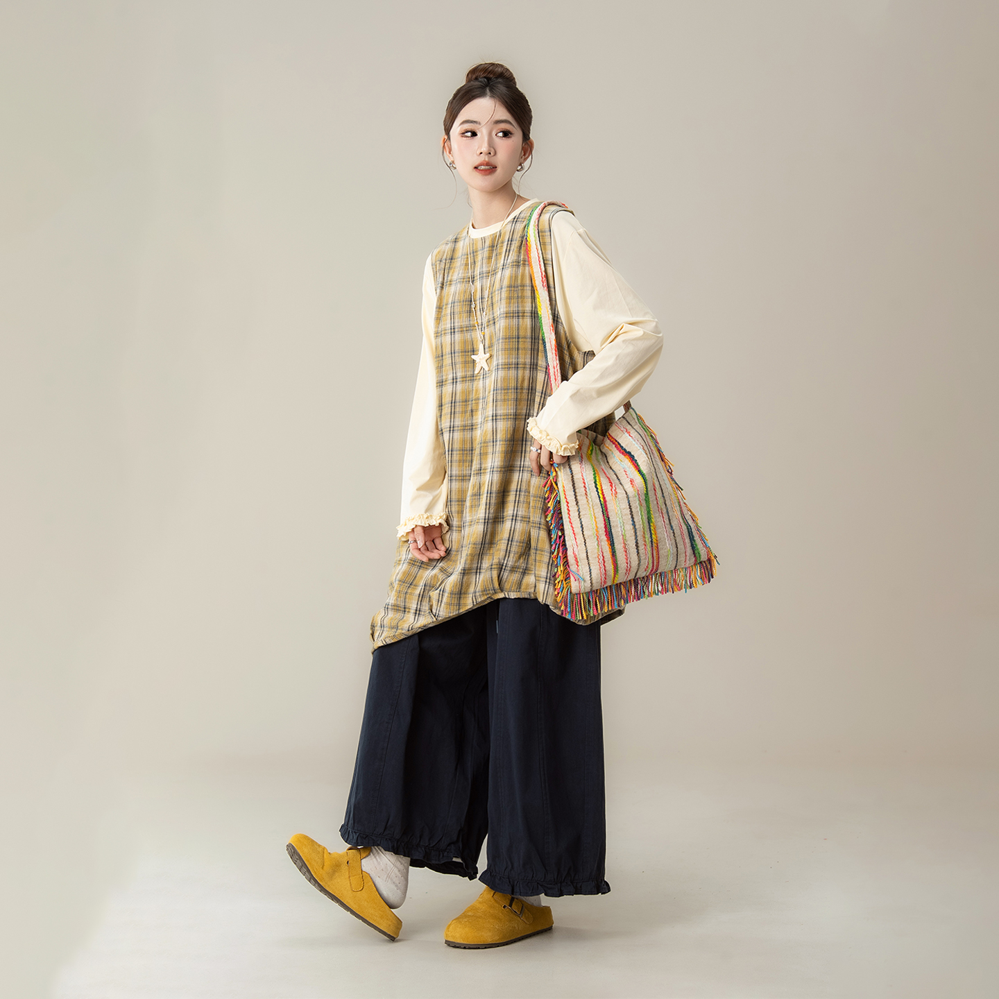 套装 叠穿内搭T恤花边阔腿裤 新款 黄色不规则格子背心连衣裙女秋季