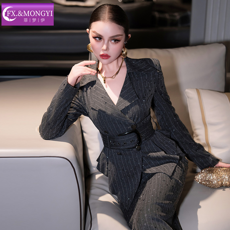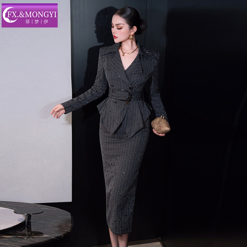 设计感气质收腰上衣包臀半身裙 女秋季 菲梦伊钉珠条纹西装 职业套装